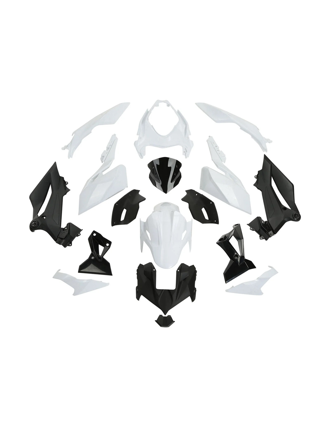 Die Verkleidungssatz enthält: Frontverkleidung, Seitenverkleidung rechts und links, Unterverkleidung, Heck, Kotflügel vorne und alle eventuellen inneren schwarzen Kunststoffe.