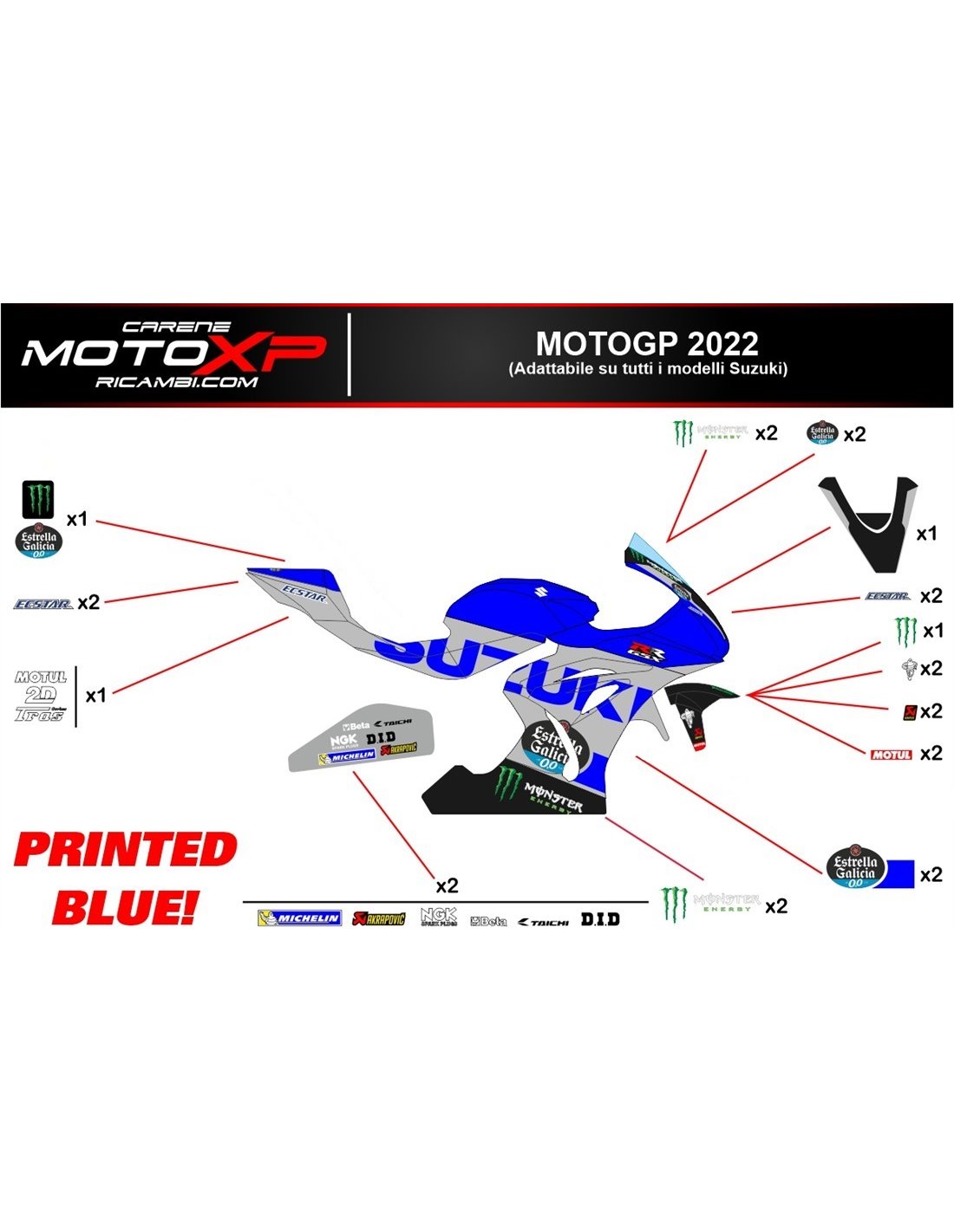 Die Aufkleber werden aus hochwertigen Materialien hergestellt und sind an die Maße des Motorrades, die der Kunde beim Kauf angibt, angepasst. Das Kit enthält alle nicht originalen Aufkleber, um das gewünschte Design zu vervollständigen: für das vordere obere Teil, die rechte und linke Seitenverkleidung, die Bugspoiler, den Höcker, die Schwinge und den vorderen Kotflügel. Es ist auch möglich, Aufkleber selbst zu individualisieren (Farben, Zahlen, Namen usw.). Es ist wichtig, Änderungen in das Feld "Weitere Informationen" zu schreiben. Der Preis des Aufkleber-Kits ändert sich nicht, es sei denn, wesentliche Änderungen (z. B. fluoreszierende Farben). Durch den Kauf akzeptiert man die Verkaufsbedingungen.Sie können sie unter dem Klarlack oder danach kleben. Sofern nicht anders gewünscht, liefern wir den Aufkleber mit dem Schutz.