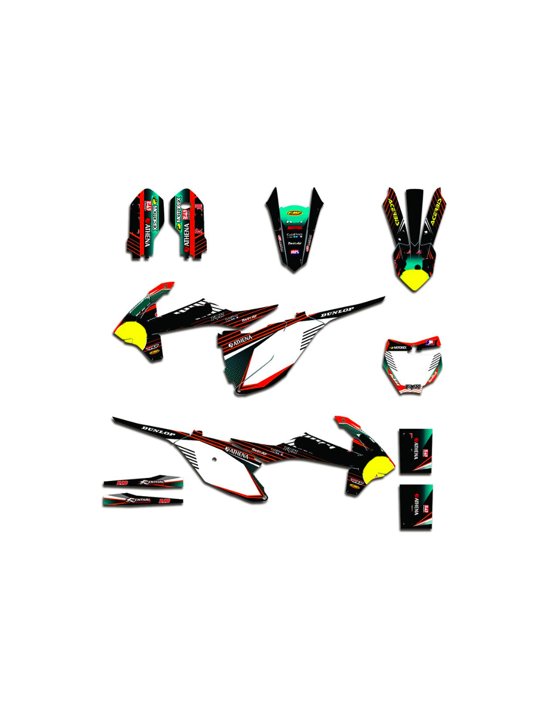 Die von uns hergestellten Aufkleber bestehen aus hochwertigen Crystalmaterialien, die einfach und perfekt an die Kunststoffe des Motorrads des Kunden angepasst werden. Die Widerstandsfähigkeit des Materials ermöglicht es, dass unsere Grafik auch unter den schwierigsten Einsatzbedingungen des Motorrads perfekt haftet. Die Installation, dank der Kanäle für die Luftabgabe, lässt Sie die Aufkleber reibungslos und ohne Blasen anbringen. Wir verwenden für den Druck Maschinen der neuesten Generation, damit wir leuchtende Farben und hochwertige Farbtöne drucken können. Wir haben die Aufkleber mit einer Schutzschicht versehen, damit sie im Laufe der Jahre immer hell bleiben und vor Wasser und Schmutz geschützt sind. Es ist möglich, die Aufkleber nach Ihren Wünschen anzupassen. Sie können Techniker-Sponsoren hinzufügen, entfernen oder ändern, eine benutzerdefinierte Startnummer oder Ihren eigenen Namen hinzufügen. Alle Änderungen können Sie während des Kaufs im Feld „Benutzeranpassung“ auf der Website angeben. Wir beschränken uns nicht nur auf die Grafiken auf unserer Website, Sie können uns per E-Mail oder WhatsApp ein Bild von einem Design senden, das wir nicht haben, damit wir Ihnen ein Angebot unterbreiten und es dann erstellen können. Durch den Kauf akzeptiert man die Verkaufsbedingungen.