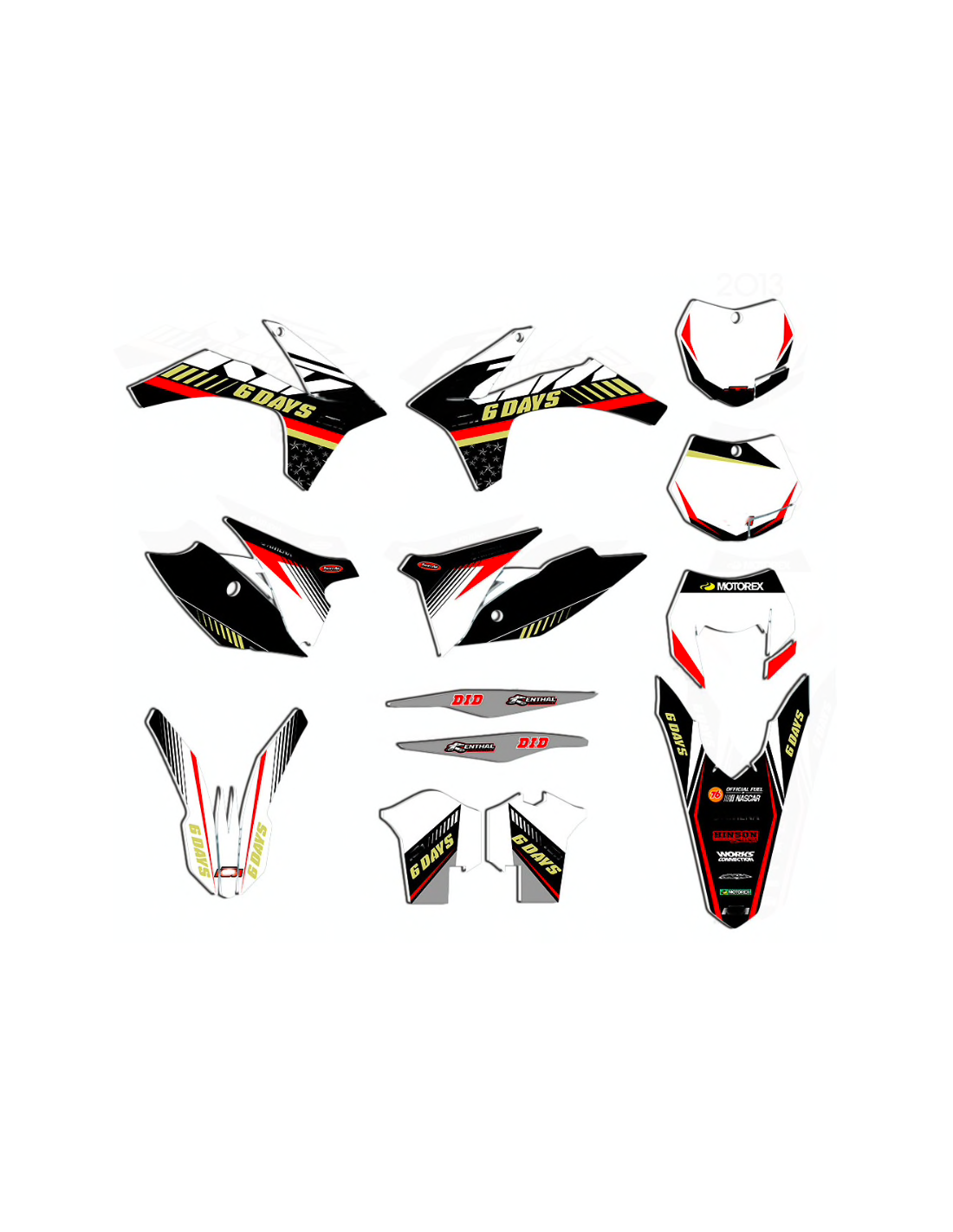 Die von uns hergestellten Aufkleber bestehen aus hochwertigen Crystalmaterialien, die einfach und perfekt an die Kunststoffe des Motorrads des Kunden angepasst werden. Die Widerstandsfähigkeit des Materials ermöglicht es, dass unsere Grafik auch unter den schwierigsten Einsatzbedingungen des Motorrads perfekt haftet. Die Installation, dank der Kanäle für die Luftabgabe, lässt Sie die Aufkleber reibungslos und ohne Blasen anbringen. Wir verwenden für den Druck Maschinen der neuesten Generation, damit wir leuchtende Farben und hochwertige Farbtöne drucken können. Wir haben die Aufkleber mit einer Schutzschicht versehen, damit sie im Laufe der Jahre immer hell bleiben und vor Wasser und Schmutz geschützt sind. Es ist möglich, die Aufkleber nach Ihren Wünschen anzupassen. Sie können Techniker-Sponsoren hinzufügen, entfernen oder ändern, eine benutzerdefinierte Startnummer oder Ihren eigenen Namen hinzufügen. Alle Änderungen können Sie während des Kaufs im Feld „Benutzeranpassung“ auf der Website angeben. Wir beschränken uns nicht nur auf die Grafiken auf unserer Website, Sie können uns per E-Mail oder WhatsApp ein Bild von einem Design senden, das wir nicht haben, damit wir Ihnen ein Angebot unterbreiten und es dann erstellen können. Durch den Kauf akzeptiert man die Verkaufsbedingungen.