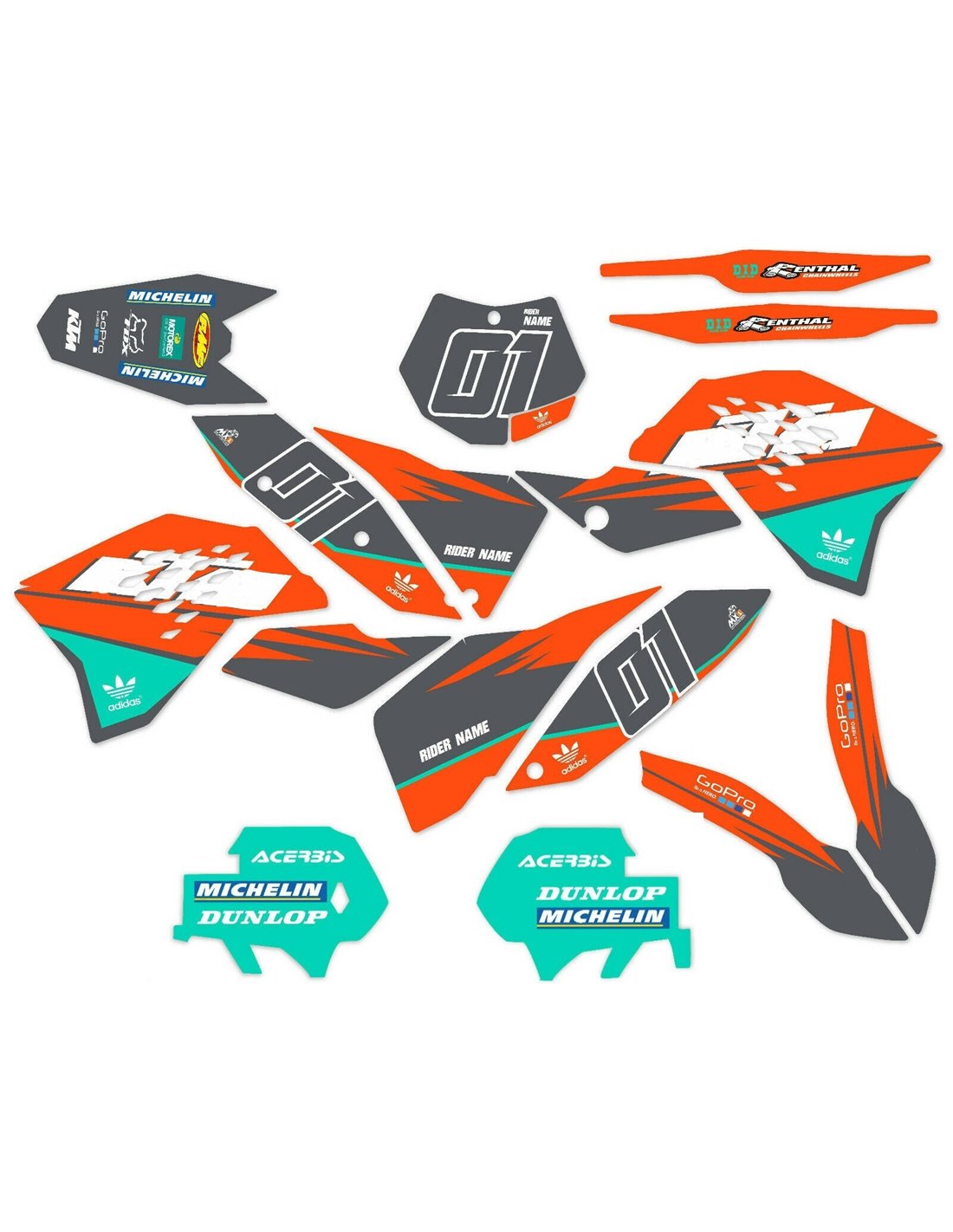 Die von uns hergestellten Aufkleber bestehen aus hochwertigen Crystalmaterialien, die einfach und perfekt an die Kunststoffe des Motorrads des Kunden angepasst werden. Die Widerstandsfähigkeit des Materials ermöglicht es, dass unsere Grafik auch unter den schwierigsten Einsatzbedingungen des Motorrads perfekt haftet. Die Installation, dank der Kanäle für die Luftabgabe, lässt Sie die Aufkleber reibungslos und ohne Blasen anbringen. Wir verwenden für den Druck Maschinen der neuesten Generation, damit wir leuchtende Farben und hochwertige Farbtöne drucken können. Wir haben die Aufkleber mit einer Schutzschicht versehen, damit sie im Laufe der Jahre immer hell bleiben und vor Wasser und Schmutz geschützt sind. Es ist möglich, die Aufkleber nach Ihren Wünschen anzupassen. Sie können Techniker-Sponsoren hinzufügen, entfernen oder ändern, eine benutzerdefinierte Startnummer oder Ihren eigenen Namen hinzufügen. Alle Änderungen können Sie während des Kaufs im Feld „Benutzeranpassung“ auf der Website angeben. Wir beschränken uns nicht nur auf die Grafiken auf unserer Website, Sie können uns per E-Mail oder WhatsApp ein Bild von einem Design senden, das wir nicht haben, damit wir Ihnen ein Angebot unterbreiten und es dann erstellen können. Durch den Kauf akzeptiert man die Verkaufsbedingungen.