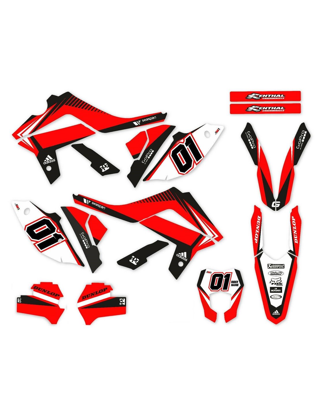 Die von uns hergestellten Aufkleber bestehen aus hochwertigen Crystalmaterialien, die einfach und perfekt an die Kunststoffe des Motorrads des Kunden angepasst werden. Die Widerstandsfähigkeit des Materials ermöglicht es, dass unsere Grafik auch unter den schwierigsten Einsatzbedingungen des Motorrads perfekt haftet. Die Installation, dank der Kanäle für die Luftabgabe, lässt Sie die Aufkleber reibungslos und ohne Blasen anbringen. Wir verwenden für den Druck Maschinen der neuesten Generation, damit wir leuchtende Farben und hochwertige Farbtöne drucken können. Wir haben die Aufkleber mit einer Schutzschicht versehen, damit sie im Laufe der Jahre immer hell bleiben und vor Wasser und Schmutz geschützt sind. Es ist möglich, die Aufkleber nach Ihren Wünschen anzupassen. Sie können Techniker-Sponsoren hinzufügen, entfernen oder ändern, eine benutzerdefinierte Startnummer oder Ihren eigenen Namen hinzufügen. Alle Änderungen können Sie während des Kaufs im Feld „Benutzeranpassung“ auf der Website angeben. Wir beschränken uns nicht nur auf die Grafiken auf unserer Website, Sie können uns per E-Mail oder WhatsApp ein Bild von einem Design senden, das wir nicht haben, damit wir Ihnen ein Angebot unterbreiten und es dann erstellen können. Durch den Kauf akzeptiert man die Verkaufsbedingungen.