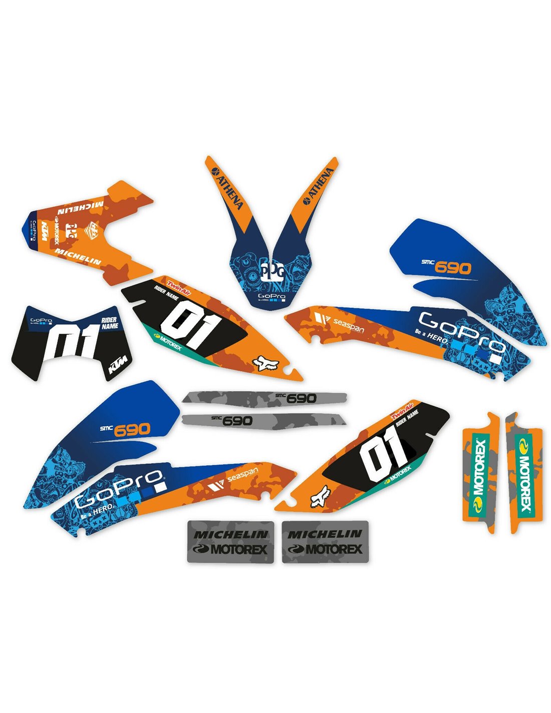 Die von uns hergestellten Aufkleber bestehen aus hochwertigen Crystalmaterialien, die einfach und perfekt an die Kunststoffe des Motorrads des Kunden angepasst werden. Die Widerstandsfähigkeit des Materials ermöglicht es, dass unsere Grafik auch unter den schwierigsten Einsatzbedingungen des Motorrads perfekt haftet. Die Installation, dank der Kanäle für die Luftabgabe, lässt Sie die Aufkleber reibungslos und ohne Blasen anbringen. Wir verwenden für den Druck Maschinen der neuesten Generation, damit wir leuchtende Farben und hochwertige Farbtöne drucken können. Wir haben die Aufkleber mit einer Schutzschicht versehen, damit sie im Laufe der Jahre immer hell bleiben und vor Wasser und Schmutz geschützt sind. Es ist möglich, die Aufkleber nach Ihren Wünschen anzupassen. Sie können Techniker-Sponsoren hinzufügen, entfernen oder ändern, eine benutzerdefinierte Startnummer oder Ihren eigenen Namen hinzufügen. Alle Änderungen können Sie während des Kaufs im Feld „Benutzeranpassung“ auf der Website angeben. Wir beschränken uns nicht nur auf die Grafiken auf unserer Website, Sie können uns per E-Mail oder WhatsApp ein Bild von einem Design senden, das wir nicht haben, damit wir Ihnen ein Angebot unterbreiten und es dann erstellen können. Durch den Kauf akzeptiert man die Verkaufsbedingungen.