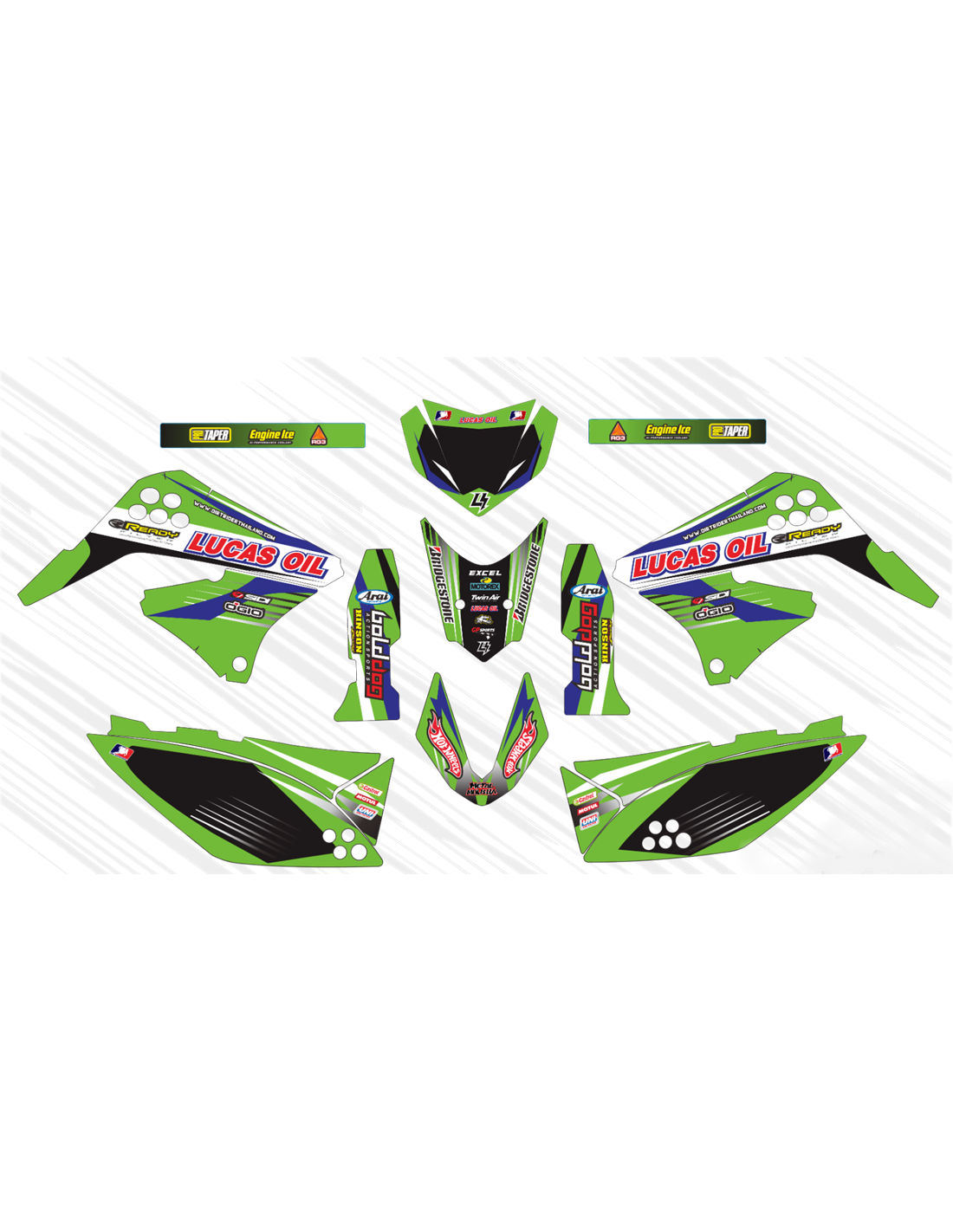 Die von uns hergestellten Aufkleber bestehen aus hochwertigen Crystalmaterialien, die einfach und perfekt an die Kunststoffe des Motorrads des Kunden angepasst werden. Die Widerstandsfähigkeit des Materials ermöglicht es, dass unsere Grafik auch unter den schwierigsten Einsatzbedingungen des Motorrads perfekt haftet. Die Installation, dank der Kanäle für die Luftabgabe, lässt Sie die Aufkleber reibungslos und ohne Blasen anbringen. Wir verwenden für den Druck Maschinen der neuesten Generation, damit wir leuchtende Farben und hochwertige Farbtöne drucken können. Wir haben die Aufkleber mit einer Schutzschicht versehen, damit sie im Laufe der Jahre immer hell bleiben und vor Wasser und Schmutz geschützt sind. Es ist möglich, die Aufkleber nach Ihren Wünschen anzupassen. Sie können Techniker-Sponsoren hinzufügen, entfernen oder ändern, eine benutzerdefinierte Startnummer oder Ihren eigenen Namen hinzufügen. Alle Änderungen können Sie während des Kaufs im Feld „Benutzeranpassung“ auf der Website angeben. Wir beschränken uns nicht nur auf die Grafiken auf unserer Website, Sie können uns per E-Mail oder WhatsApp ein Bild von einem Design senden, das wir nicht haben, damit wir Ihnen ein Angebot unterbreiten und es dann erstellen können. Durch den Kauf akzeptiert man die Verkaufsbedingungen.