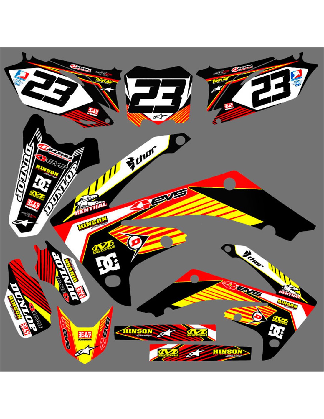 Die von uns hergestellten Aufkleber bestehen aus hochwertigen Crystalmaterialien, die einfach und perfekt an die Kunststoffe des Motorrads des Kunden angepasst werden. Die Widerstandsfähigkeit des Materials ermöglicht es, dass unsere Grafik auch unter den schwierigsten Einsatzbedingungen des Motorrads perfekt haftet. Die Installation, dank der Kanäle für die Luftabgabe, lässt Sie die Aufkleber reibungslos und ohne Blasen anbringen. Wir verwenden für den Druck Maschinen der neuesten Generation, damit wir leuchtende Farben und hochwertige Farbtöne drucken können. Wir haben die Aufkleber mit einer Schutzschicht versehen, damit sie im Laufe der Jahre immer hell bleiben und vor Wasser und Schmutz geschützt sind. Es ist möglich, die Aufkleber nach Ihren Wünschen anzupassen. Sie können Techniker-Sponsoren hinzufügen, entfernen oder ändern, eine benutzerdefinierte Startnummer oder Ihren eigenen Namen hinzufügen. Alle Änderungen können Sie während des Kaufs im Feld „Benutzeranpassung“ auf der Website angeben. Wir beschränken uns nicht nur auf die Grafiken auf unserer Website, Sie können uns per E-Mail oder WhatsApp ein Bild von einem Design senden, das wir nicht haben, damit wir Ihnen ein Angebot unterbreiten und es dann erstellen können. Durch den Kauf akzeptiert man die Verkaufsbedingungen.