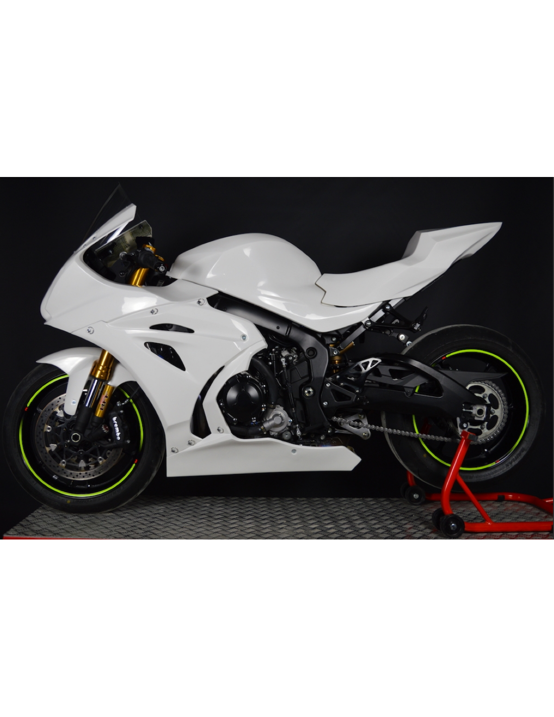 Unsere Rennverkleidung sind auf Fiberglas, sie sind auf Carbon und Kevlar in Stresszonen verstärkt. Unsere Unterverkleidung ist eingeschlossen, so die Verkleidung sind für verschiedene Meisterschaften und für die Amateur-Nutzung auf den Rennstrecken genehmigt. Wir markieren wo Sie die Löcher bohren sollten, so Sie können das Loch nach der Abmessung der Schraube, die Sie verwenden möchten, machen.