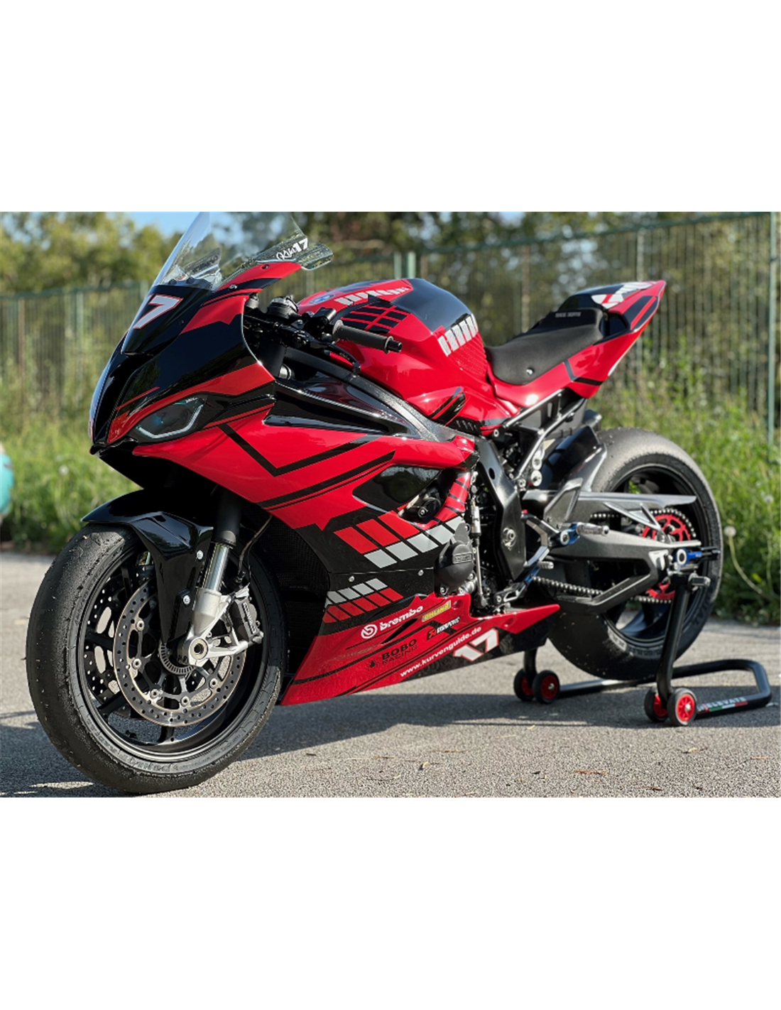 Die Verkleidungssatz enthält: Frontverkleidung, Seitenverkleidung rechts und links, geschlossene Unterverkleidung und zugelassen für die Rennstrecke, Heck und Kotflügel vorne (Tankabdeckung ist nicht eingeschlossen).