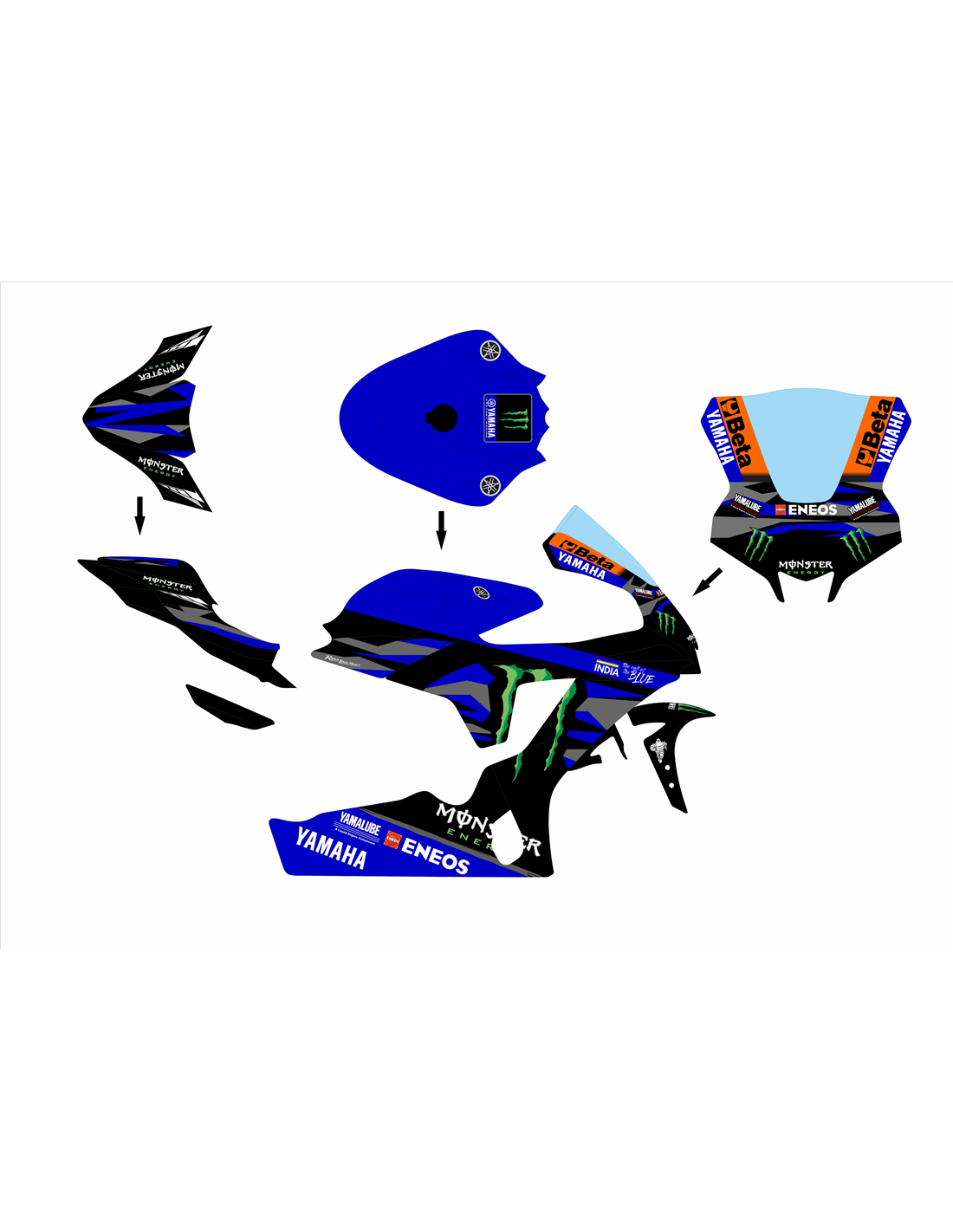 Die Verkleidungssatz enthält: Frontverkleidung, Seitenverkleidung rechts und links, geschlossene Unterverkleidung und zugelassen für die Rennstrecke, Heck (Tankabdeckung, und Kotflügel vorne ist nicht eingeschlossen).