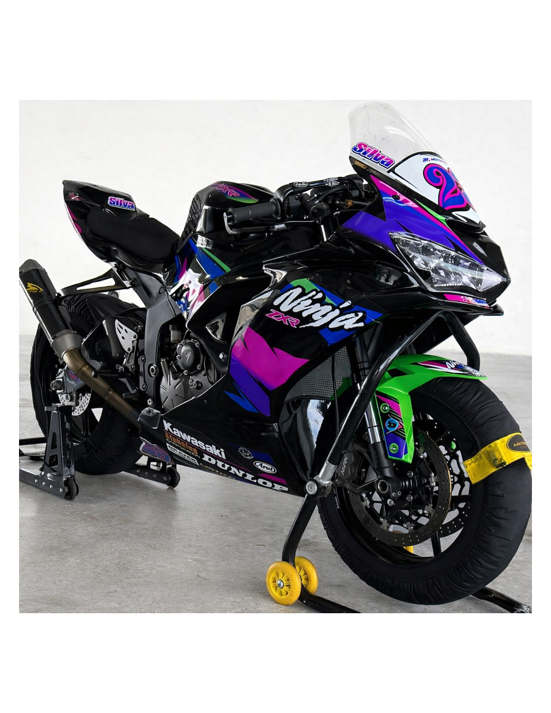 Elite: Wir verwenden kompatible Farben mit dem Originaltank des Motorrads (z. B. Kawasakis Grün). Die Aufkleber werden mit 8-Farben-Druckern gedruckt, was ihnen einen tadellosen Glanz und Farbtöne verleiht. Die gesamte Grafik befindet sich unter drei Schichten Klarlack, um die Farben der Verkleidung auch im Laufe der Zeit leuchtend zu halten. Wir lackieren auch den gesamten Verkleidungssatz innen.