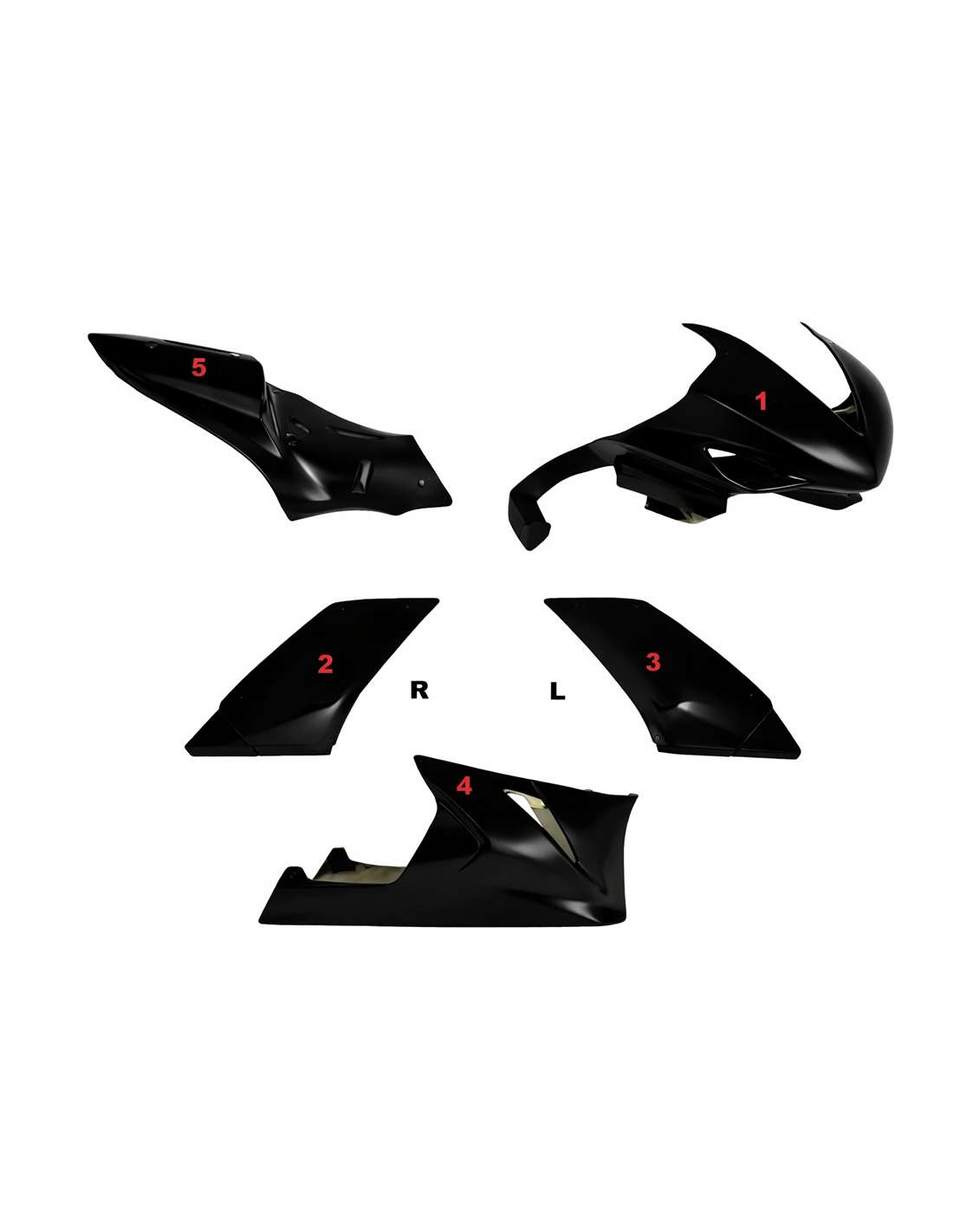 Die Verkleidungssatz enthält: Frontverkleidung, Seitenverkleidung rechts und links, Unterverkleidung, Heck (Tankabdeckung ist nicht eingeschlossen).