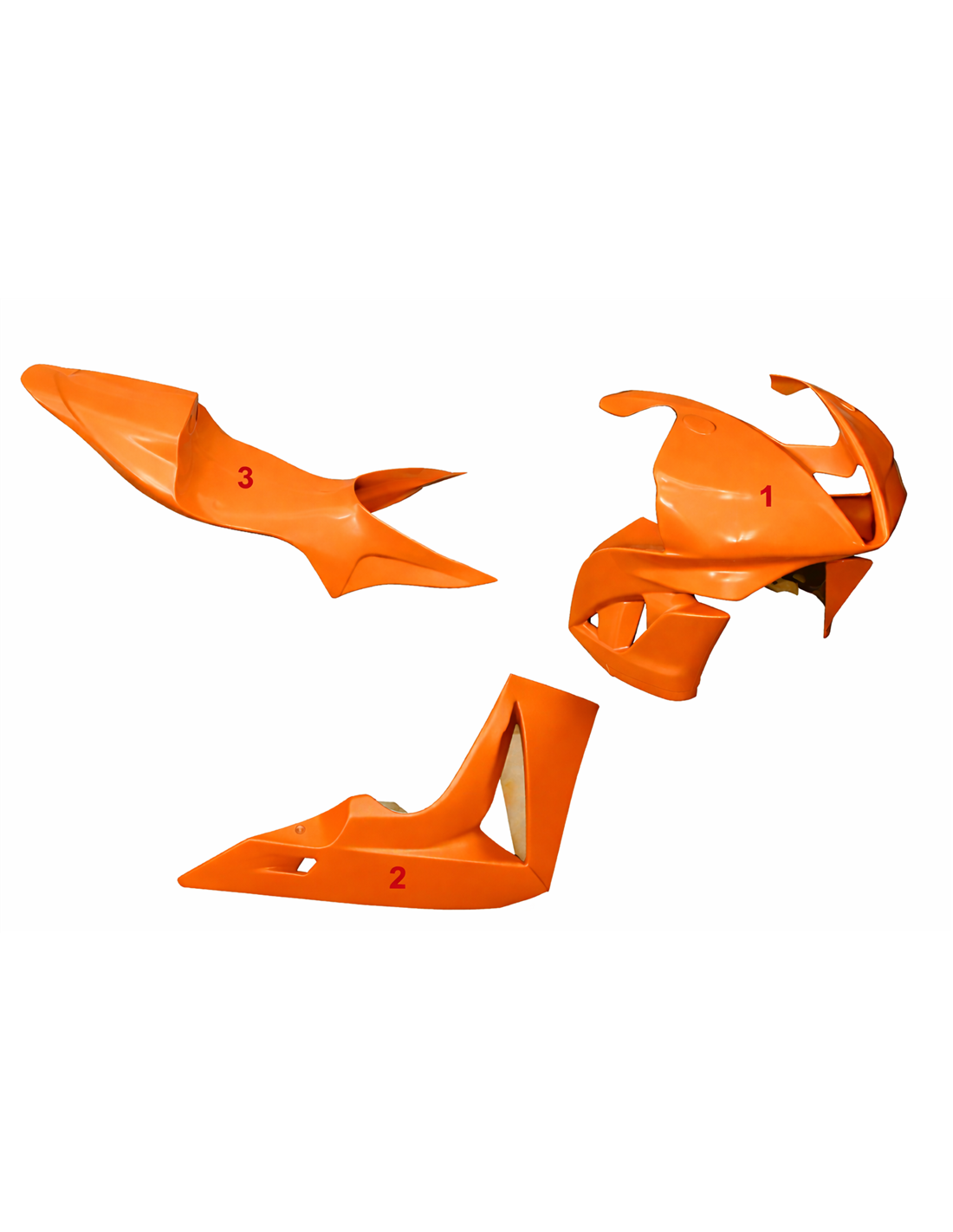 Die Verkleidungssatz enthält: Frontverkleidung, Seitenverkleidung rechts und links, Unterverkleidung, Heck (Tankabdeckung ist nicht eingeschlossen).