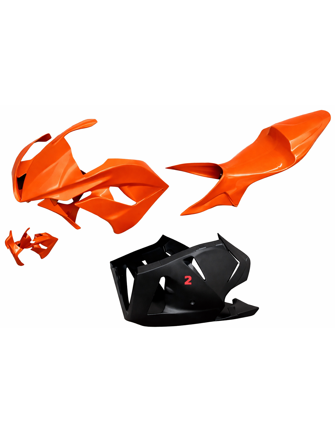 Die Verkleidungssatz enthält: Frontverkleidung, Seitenverkleidung rechts und links, Unterverkleidung, Heck (Tankabdeckung ist nicht eingeschlossen).
