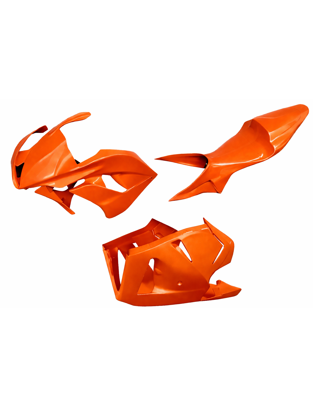 Die Verkleidungssatz enthält: Frontverkleidung, Seitenverkleidung rechts und links, Unterverkleidung, Heck (Tankabdeckung ist nicht eingeschlossen).