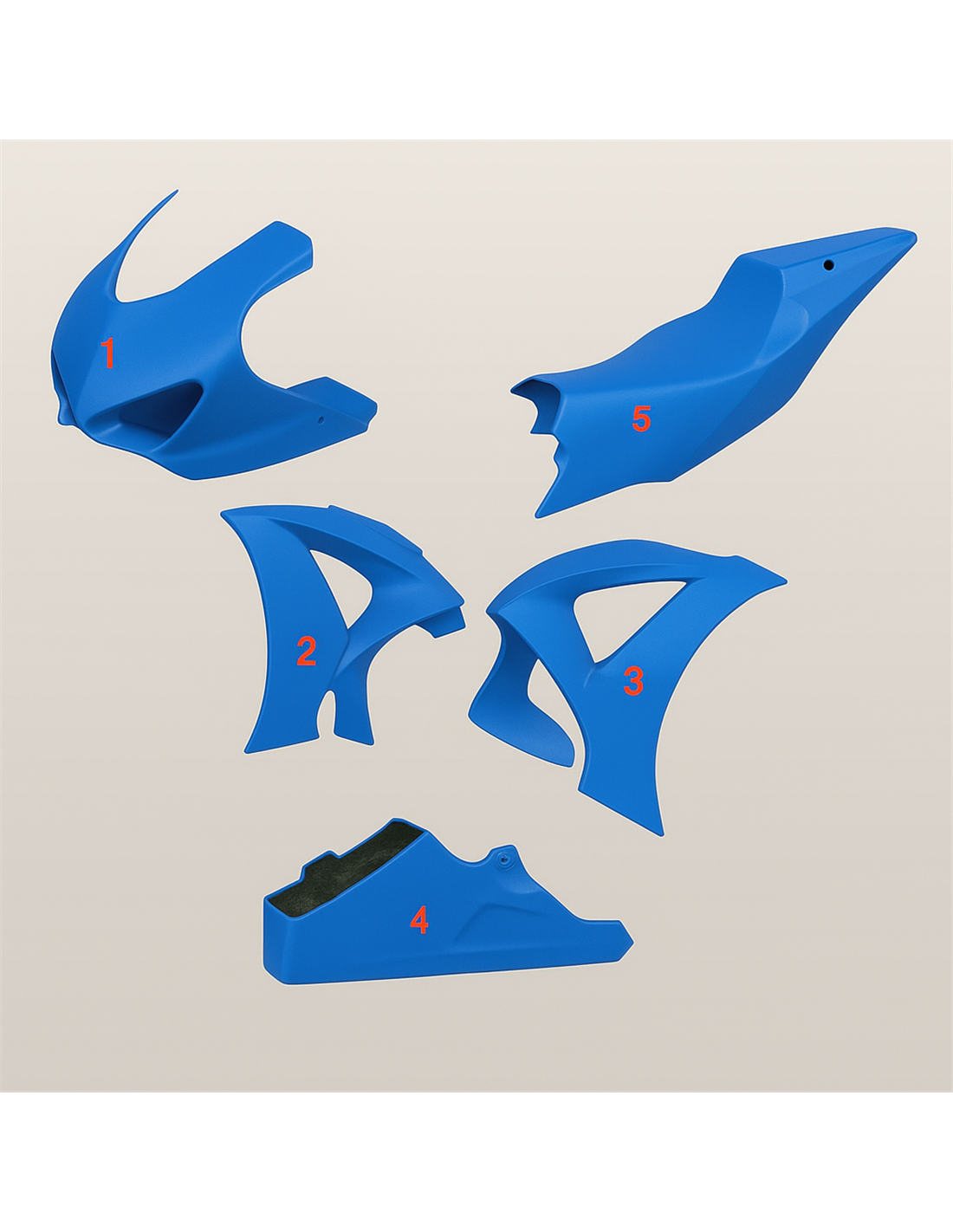 Die Verkleidungssatz enthält: Frontverkleidung, Seitenverkleidung rechts und links, Unterverkleidung, Heck (Tankabdeckung ist nicht eingeschlossen).