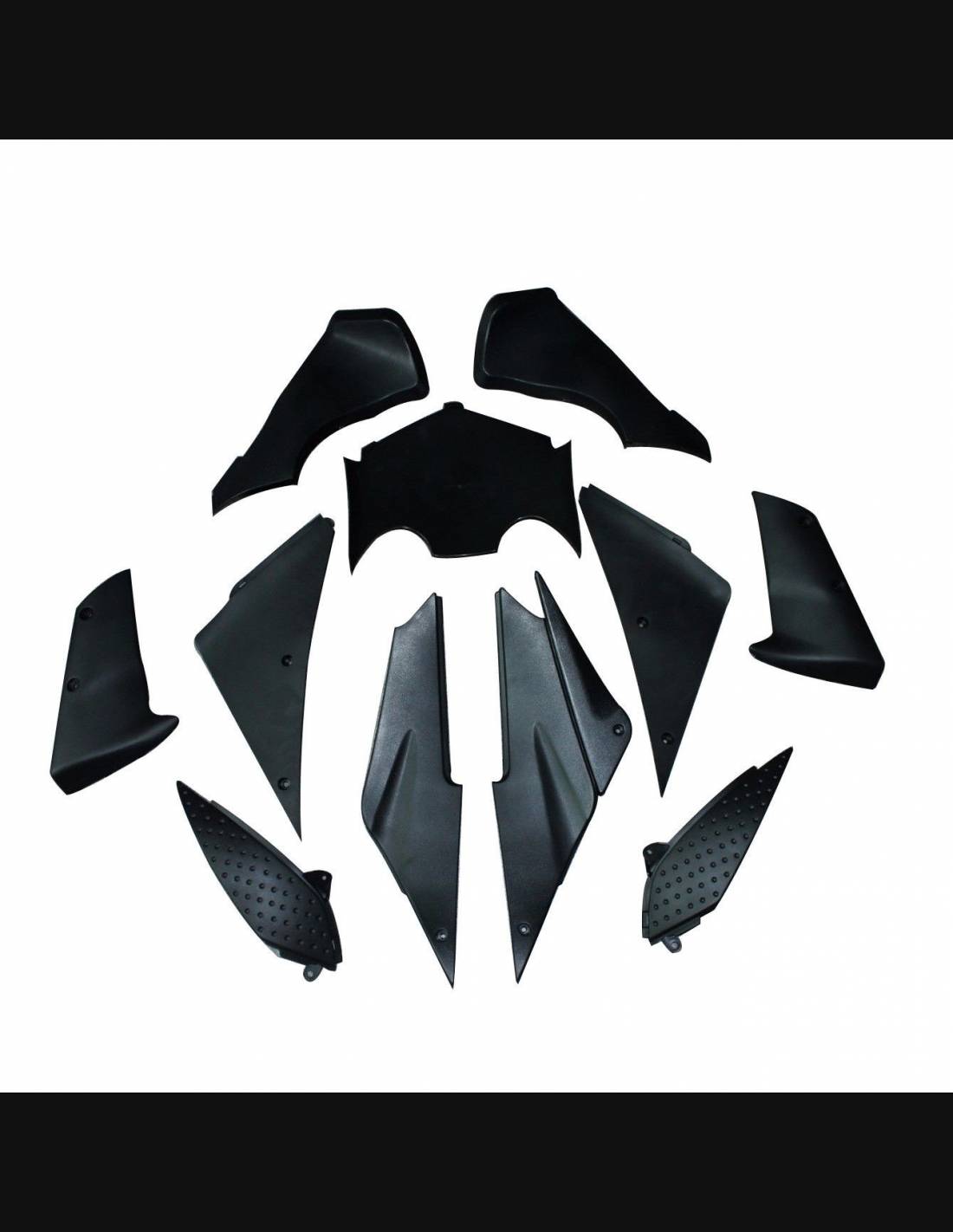 El kit de carenados incluye: carenado frontal, laterales de derecha y izquierda, quilla, colin, guardabarros delantero y todos los eventuales plasticos interiores negros.