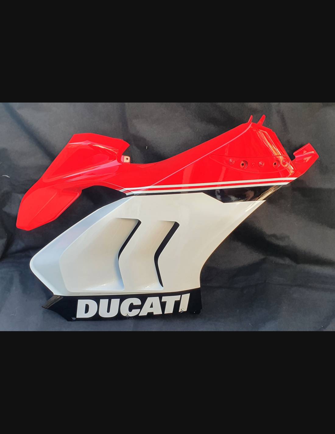 Elite: utilizamos los colores originales de la moto (Rojo Ducati); los adhesivos están impresos con varios tonos gracias a nuestro plotter de corte y de impresión de 8 colores con tintas ECO-SOLMAX2 con una alta calidad y resistencia a la luz solar hasta 7 años garantizados por la empresa APA Italia que nos da los materiales necesarios para el corte y la impresión. Los adhesivos están cubiertos por tres capas de transparente y eso los hace brillar durante 7 años. Además todo el carenado está pintado en el interior.