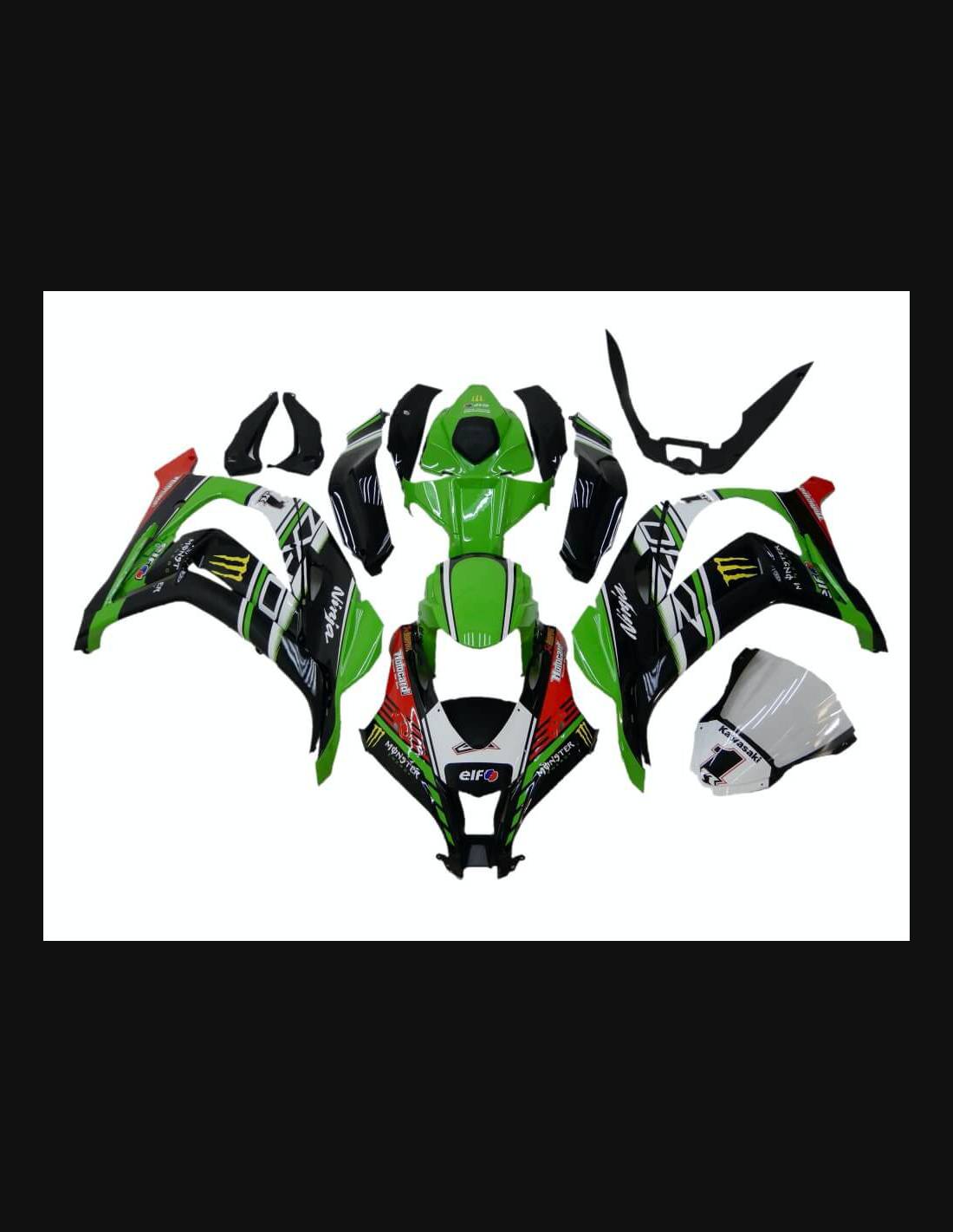 Elite: utilizamos los colores originales de la moto (Kawasaki verde); los adhesivos están impresos con varios tonos gracias a nuestro plotter de corte y de impresión de 8 colores con tintas ECO-SOLMAX2 con una alta calidad y resistencia a la luz solar hasta 7 años garantizados por la empresa APA Italia que nos da los materiales necesarios para el corte y la impresión. Los adhesivos están cubiertos por tres capas de transparente y eso los hace brillar durante 7 años. Además todo el carenado está pintado en el interior.