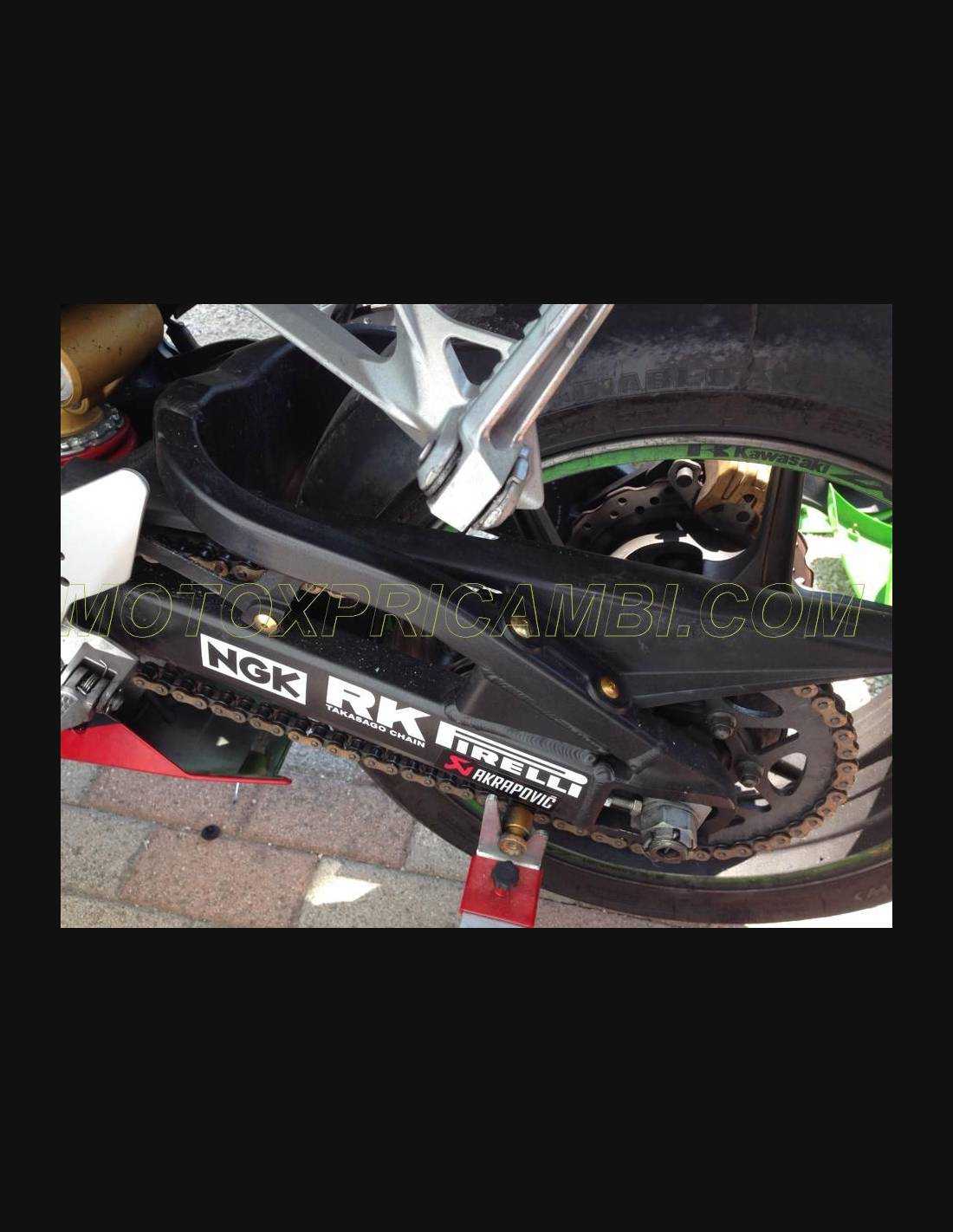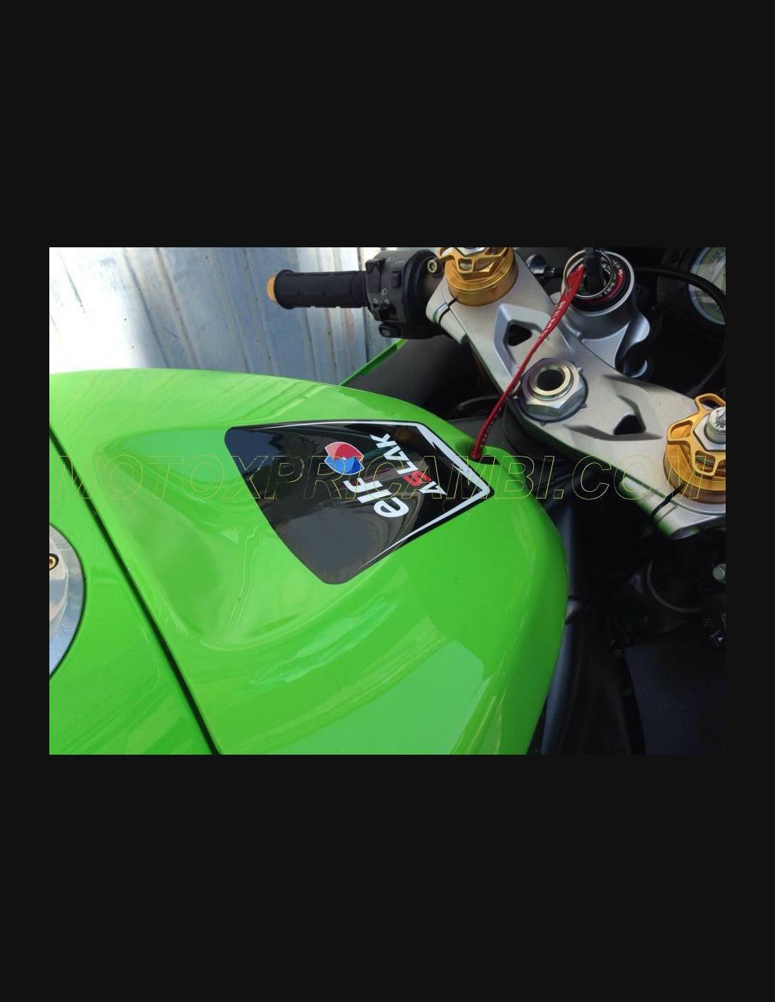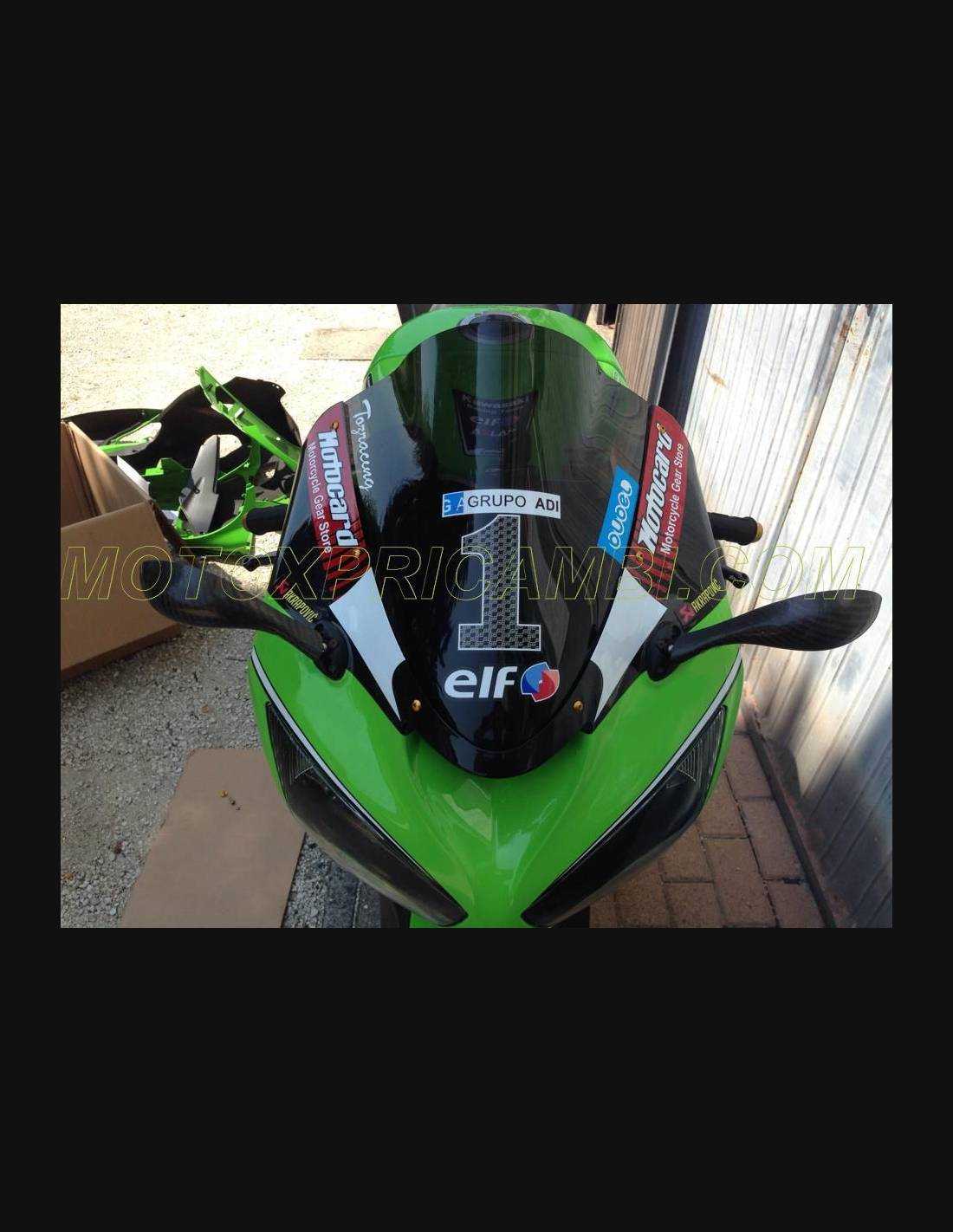 Elite: utilizamos los colores originales de la moto (Kawasaki verde); los adhesivos están impresos con varios tonos gracias a nuestro plotter de corte y de impresión de 8 colores con tintas ECO-SOLMAX2 con una alta calidad y resistencia a la luz solar hasta 7 años garantizados por la empresa APA Italia que nos da los materiales necesarios para el corte y la impresión. Los adhesivos están cubiertos por tres capas de transparente y eso los hace brillar durante 7 años. Además todo el carenado está pintado en el interior.