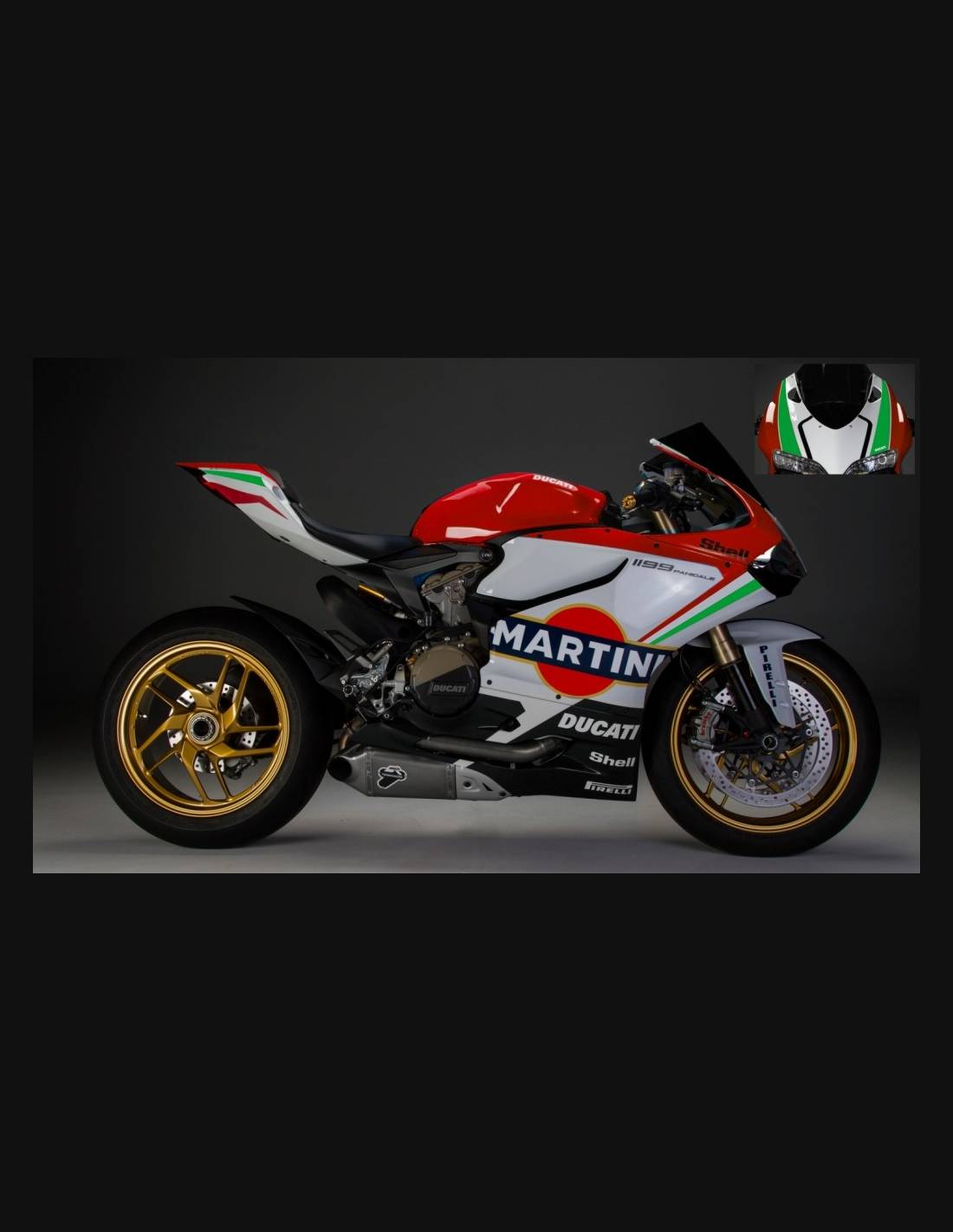 Elite: utilizamos los colores originales de la moto (Rojo Ducati); los adhesivos están impresos con varios tonos gracias a nuestro plotter de corte y de impresión de 8 colores con tintas ECO-SOLMAX2 con una alta calidad y resistencia a la luz solar hasta 7 años garantizados por la empresa APA Italia que nos da los materiales necesarios para el corte y la impresión. Los adhesivos están cubiertos por tres capas de transparente y eso los hace brillar durante 7 años. Además todo el carenado está pintado en el interior.