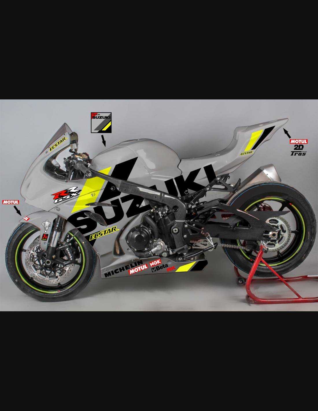 Elite: utilizamos pinturas de alta calidad con tonalidades similares a las originales. Las pegatinas se imprimen con impresoras de 8 colores que les dan un brillo y matices impecables. Todo el gráfico se encuentra bajo tres capas de transparente para mantener los colores del carenado brillantes con el tiempo. También pintamos todo el kit de carenado por dentro.