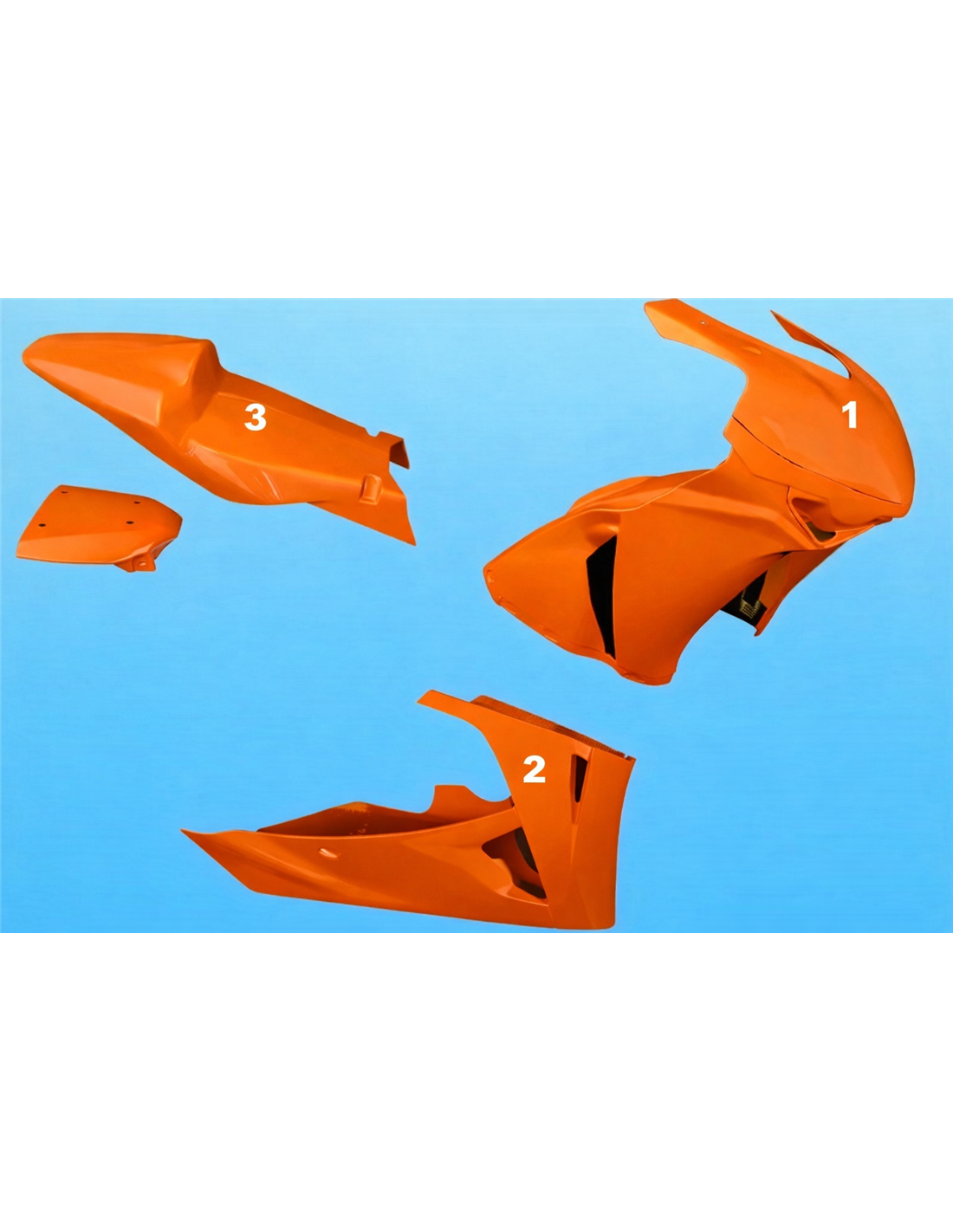 El kit de carenados incluye: carenado frontal, laterales de derecha y izquierda, quilla cerrada homologada para la pista, colin (el cubre deposito no se incluye en el precio).