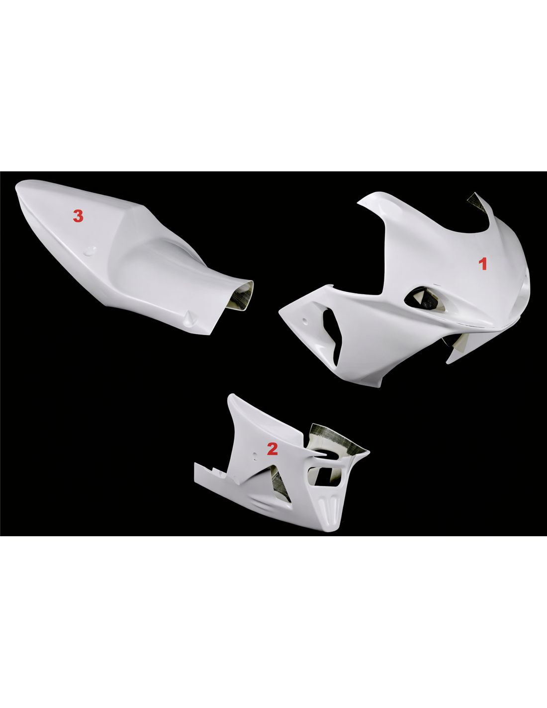 Nuestros carenados racing son en fibra de vidrio, tienen refuerzos en carbono y kevlar en las areas de major stress. Se incluye una quilla cerrada, entonces nuestros carenados son homologados para las competiciones profesionales y amatoriales en las pistas. Indicamos donde tiene que hacer los agujeros, asì puede hacer el agujero de la dimension correcta de su tornillo.