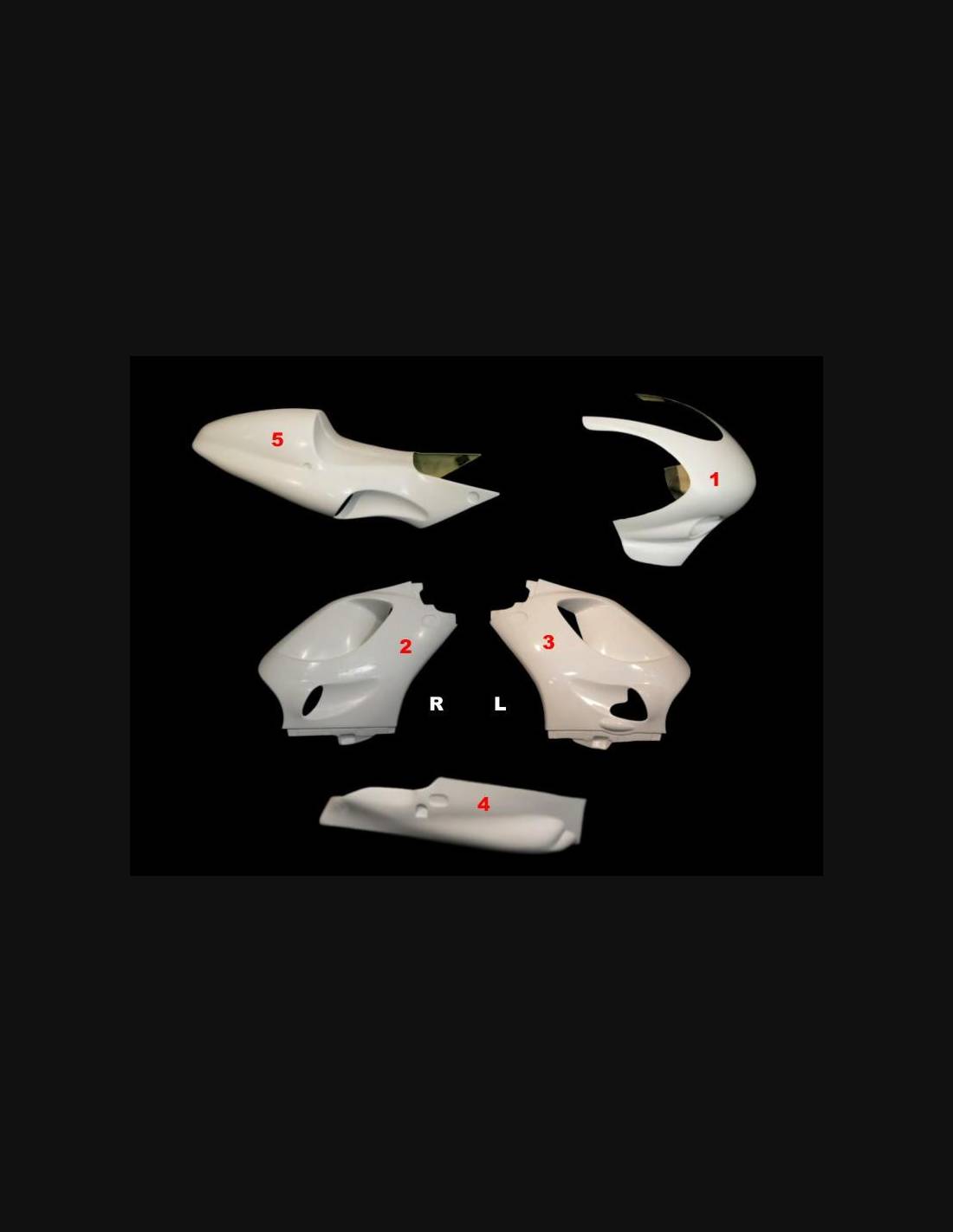 Nuestros carenados racing son en fibra de vidrio, tienen refuerzos en carbono y kevlar en las areas de major stress. Se incluye una quilla cerrada, entonces nuestros carenados son homologados para las competiciones profesionales y amatoriales en las pistas. Indicamos donde tiene que hacer los agujeros, asì puede hacer el agujero de la dimension correcta de su tornillo.