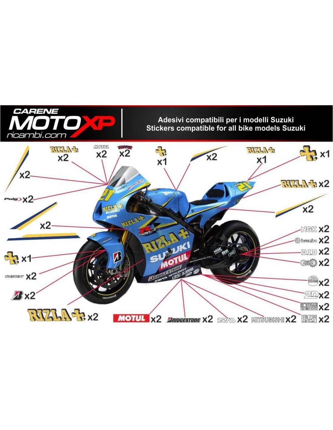 Los adhesivos están hechos de materiales de primera calidad y están dimensionados para el tipo de moto indicada en el momento de la compra. El kit se compone de todas las pegatinas no originales, para completar los gráficos elegidos: cupolo, lateral izquierdo y derecho, el tanque, quilla, colin, el basculante y el guardabarros delantero. Las pegatinas también se pueden personalizar (color, números, nombres y otros), escribir todo antes de agregar al carro en el espacio de "información adicional". El costo del kit de adhesivo no varía, excepto por modificaciones sustanciales (por ejemplo, colores fluorescentes). Mediante la compra, se aceptan las condiciones de venta.Se pueden unir por encima y por debajo de transparente. A menos que el cliente solicite lo contrario, el kit se suministra con la protección aplicada.
