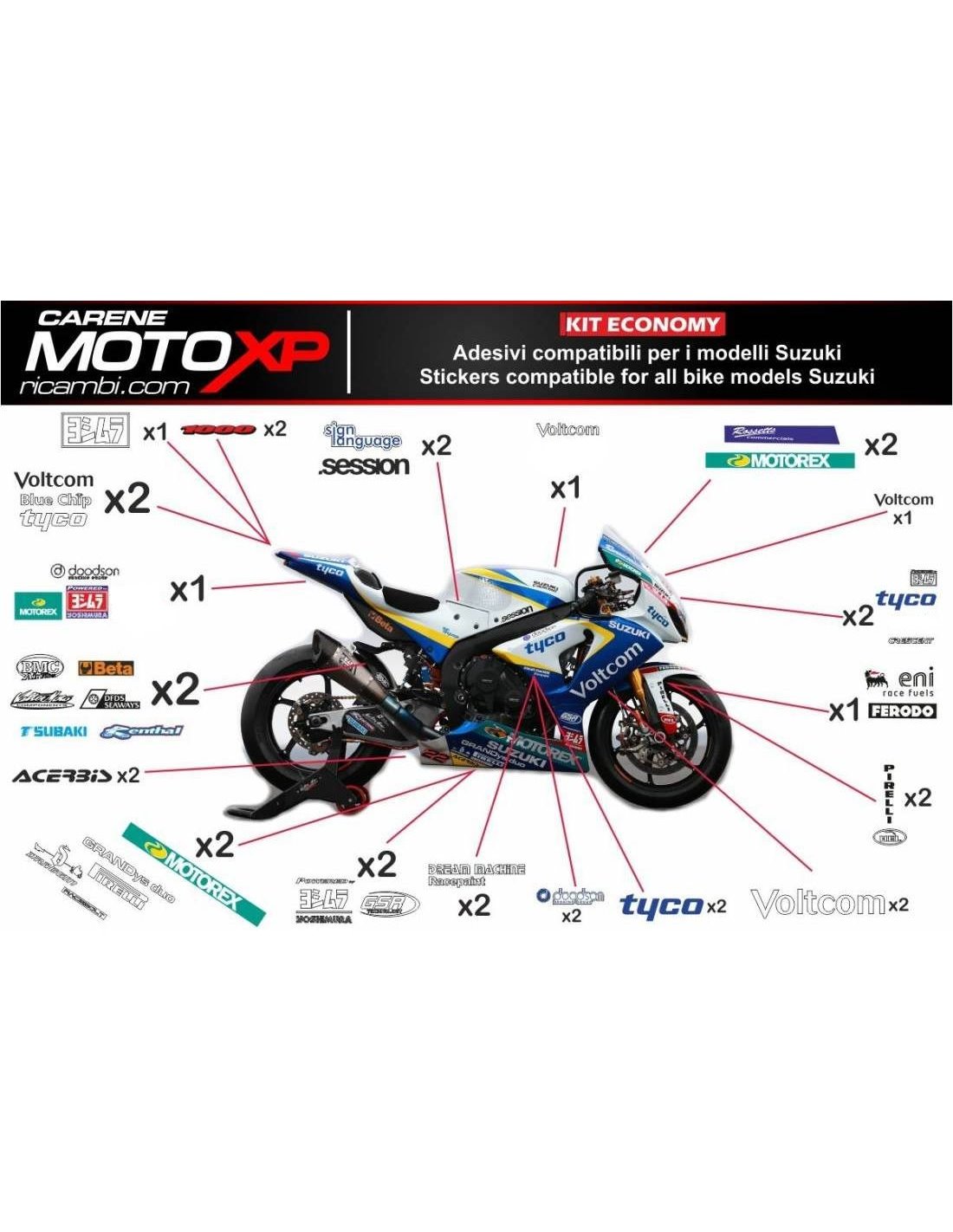 Los adhesivos están hechos de materiales de primera calidad y están dimensionados para el tipo de moto indicada en el momento de la compra. El kit se compone de todas las pegatinas no originales, para completar los gráficos elegidos: cupolo, lateral izquierdo y derecho, el tanque, quilla, colin, el basculante y el guardabarros delantero. Las pegatinas también se pueden personalizar (color, números, nombres y otros), escribir todo antes de agregar al carro en el espacio de "información adicional". El costo del kit de adhesivo no varía, excepto por modificaciones sustanciales (por ejemplo, colores fluorescentes). Mediante la compra, se aceptan las condiciones de venta.Se pueden unir por encima y por debajo de transparente. A menos que el cliente solicite lo contrario, el kit se suministra con la protección aplicada.