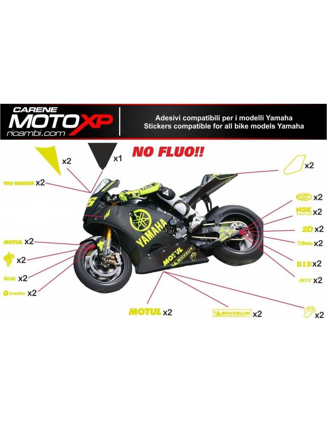 Los adhesivos están hechos de materiales de primera calidad y están dimensionados para el tipo de moto indicada en el momento de la compra. El kit se compone de todas las pegatinas no originales, para completar los gráficos elegidos: cupolo, lateral izquierdo y derecho, el tanque, quilla, colin, el basculante y el guardabarros delantero. Las pegatinas también se pueden personalizar (color, números, nombres y otros), escribir todo antes de agregar al carro en el espacio de "información adicional". El costo del kit de adhesivo no varía, excepto por modificaciones sustanciales (por ejemplo, colores fluorescentes). Mediante la compra, se aceptan las condiciones de venta.Se pueden unir por encima y por debajo de transparente. A menos que el cliente solicite lo contrario, el kit se suministra con la protección aplicada.