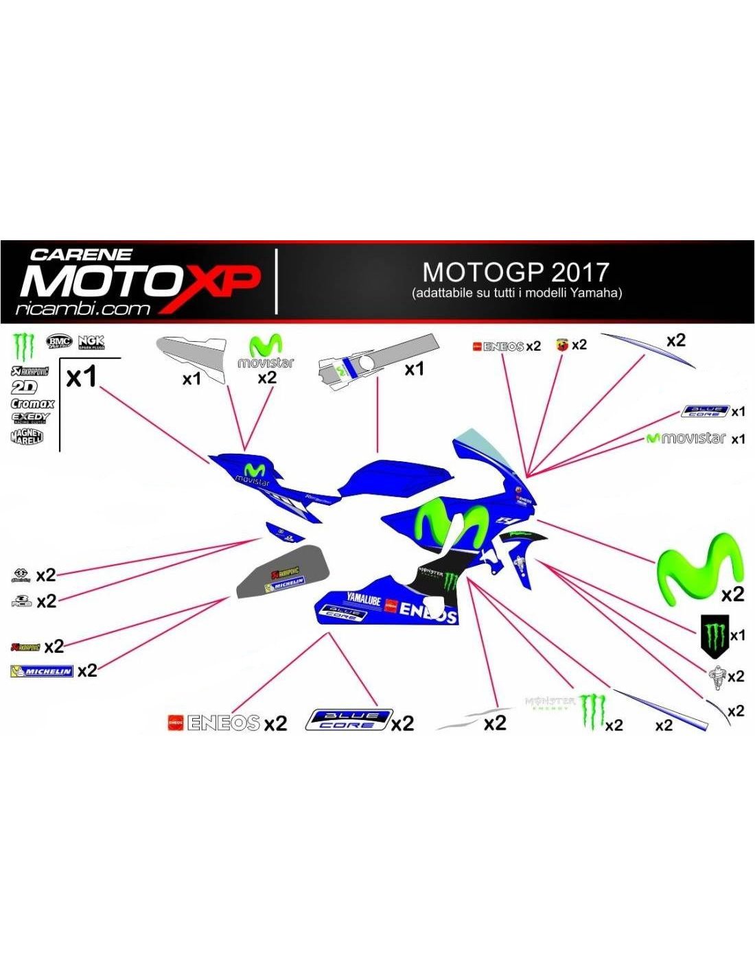 Los adhesivos están hechos de materiales de primera calidad y están dimensionados para el tipo de moto indicada en el momento de la compra. El kit se compone de todas las pegatinas no originales, para completar los gráficos elegidos: cupolo, lateral izquierdo y derecho, el tanque, quilla, colin, el basculante y el guardabarros delantero. Las pegatinas también se pueden personalizar (color, números, nombres y otros), escribir todo antes de agregar al carro en el espacio de "información adicional". El costo del kit de adhesivo no varía, excepto por modificaciones sustanciales (por ejemplo, colores fluorescentes). Mediante la compra, se aceptan las condiciones de venta.Se pueden unir por encima y por debajo de transparente. A menos que el cliente solicite lo contrario, el kit se suministra con la protección aplicada.