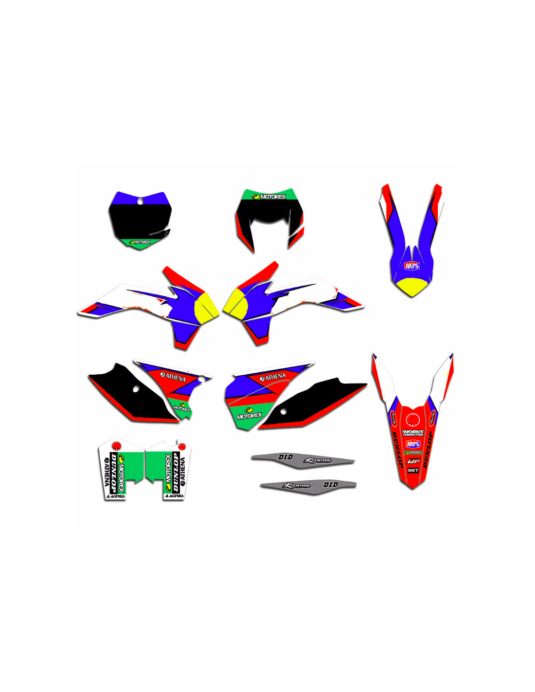 Los adhesivos que producimos están fabricados con materiales crystal de primera calidad que se adaptarán fácil y perfectamente a los plásticos de la motocicleta del cliente. La resistencia del material permite que nuestro gráfico permanezca perfectamente adherido incluso durante las condiciones de uso más difíciles de la motocicleta. La instalación, gracias a los canales de descarga de aire, permite instalar las pegatinas de forma suave y sin burbujas. Utilizamos maquinarias de última generación para la impresión, por lo que podemos imprimir colores brillantes y tonalidades de alta calidad. Incluimos una capa protectora en los adhesivos, para que estén siempre brillantes durante los años y estén protegidas del agua y la suciedad. Es posible personalizar las pegatinas como prefiera. Puede agregar, eliminar o cambiar patrocinadores técnicos, agregar un número de carrera personalizado o su propio nombre. Puede indicar todos los cambios en el campo "Personalización del producto" en el sitio web durante la compra. No nos limitamos solo a los gráficos de nuestro sitio web, puede enviarnos por correo electrónico o WhatsApp una imagen de un diseño que no tenemos, para que podamos hacerle un presupuesto y luego hacerlo. Mediante la compra, se aceptan las condiciones de venta.