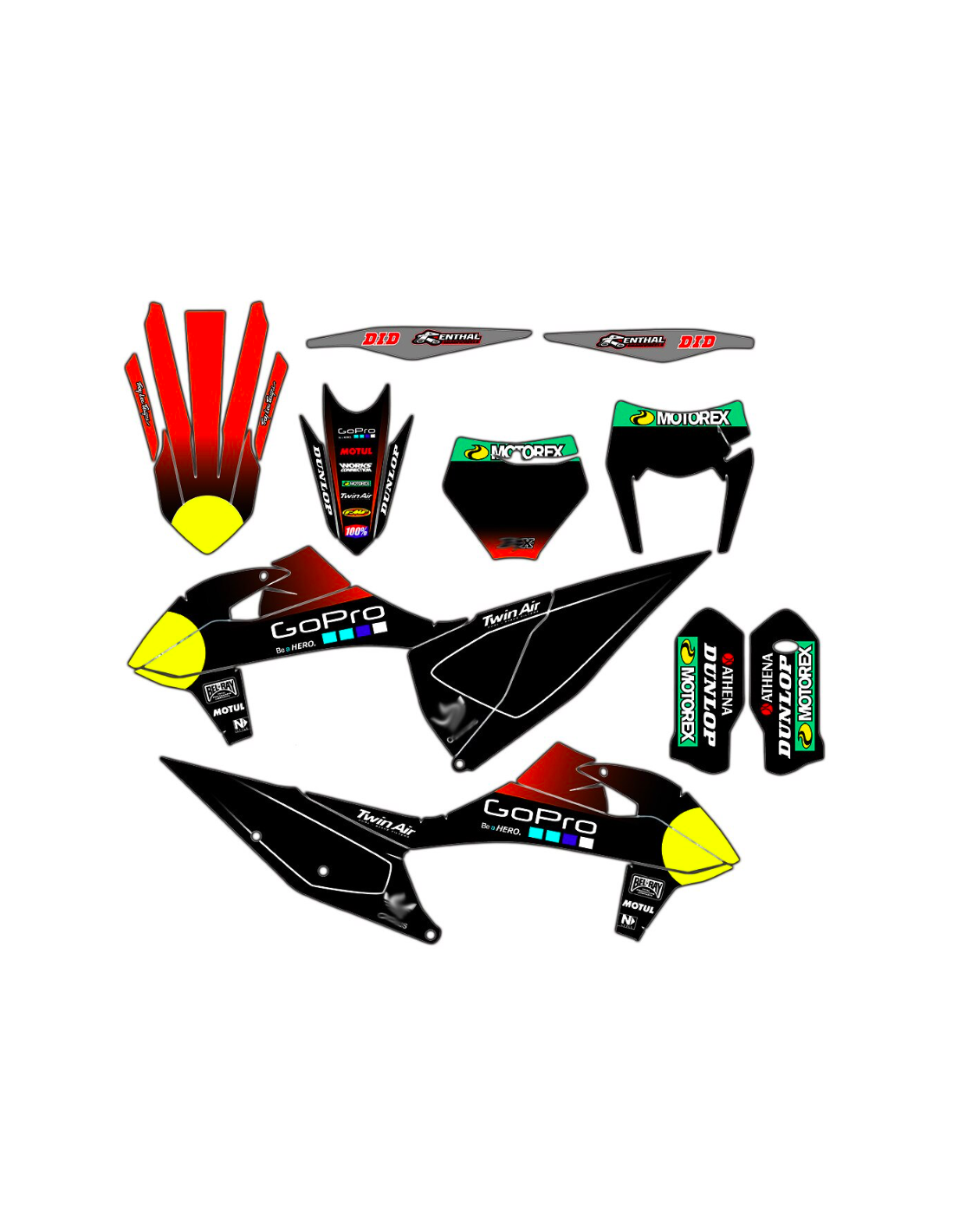 Los adhesivos que producimos están fabricados con materiales crystal de primera calidad que se adaptarán fácil y perfectamente a los plásticos de la motocicleta del cliente. La resistencia del material permite que nuestro gráfico permanezca perfectamente adherido incluso durante las condiciones de uso más difíciles de la motocicleta. La instalación, gracias a los canales de descarga de aire, permite instalar las pegatinas de forma suave y sin burbujas. Utilizamos maquinarias de última generación para la impresión, por lo que podemos imprimir colores brillantes y tonalidades de alta calidad. Incluimos una capa protectora en los adhesivos, para que estén siempre brillantes durante los años y estén protegidas del agua y la suciedad. Es posible personalizar las pegatinas como prefiera. Puede agregar, eliminar o cambiar patrocinadores técnicos, agregar un número de carrera personalizado o su propio nombre. Puede indicar todos los cambios en el campo "Personalización del producto" en el sitio web durante la compra. No nos limitamos solo a los gráficos de nuestro sitio web, puede enviarnos por correo electrónico o WhatsApp una imagen de un diseño que no tenemos, para que podamos hacerle un presupuesto y luego hacerlo. Mediante la compra, se aceptan las condiciones de venta.