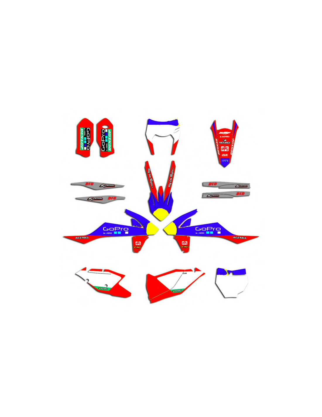 Los adhesivos que producimos están fabricados con materiales crystal de primera calidad que se adaptarán fácil y perfectamente a los plásticos de la motocicleta del cliente. La resistencia del material permite que nuestro gráfico permanezca perfectamente adherido incluso durante las condiciones de uso más difíciles de la motocicleta. La instalación, gracias a los canales de descarga de aire, permite instalar las pegatinas de forma suave y sin burbujas. Utilizamos maquinarias de última generación para la impresión, por lo que podemos imprimir colores brillantes y tonalidades de alta calidad. Incluimos una capa protectora en los adhesivos, para que estén siempre brillantes durante los años y estén protegidas del agua y la suciedad. Es posible personalizar las pegatinas como prefiera. Puede agregar, eliminar o cambiar patrocinadores técnicos, agregar un número de carrera personalizado o su propio nombre. Puede indicar todos los cambios en el campo "Personalización del producto" en el sitio web durante la compra. No nos limitamos solo a los gráficos de nuestro sitio web, puede enviarnos por correo electrónico o WhatsApp una imagen de un diseño que no tenemos, para que podamos hacerle un presupuesto y luego hacerlo. Mediante la compra, se aceptan las condiciones de venta.