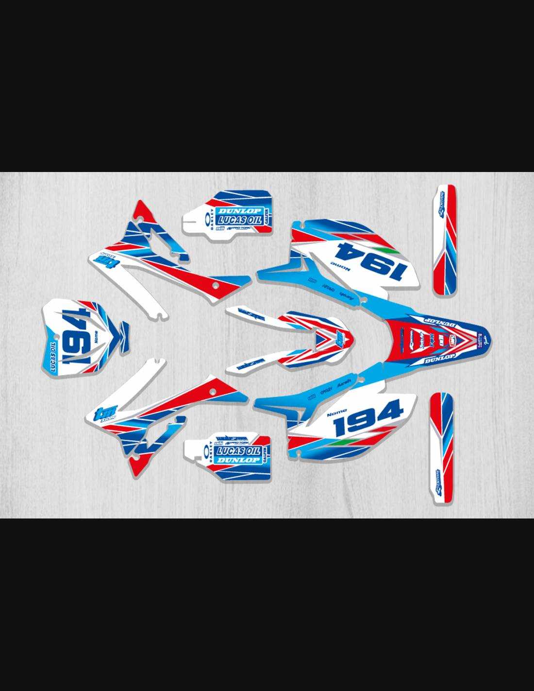 Los adhesivos que producimos están fabricados con materiales crystal de primera calidad que se adaptarán fácil y perfectamente a los plásticos de la motocicleta del cliente. La resistencia del material permite que nuestro gráfico permanezca perfectamente adherido incluso durante las condiciones de uso más difíciles de la motocicleta. La instalación, gracias a los canales de descarga de aire, permite instalar las pegatinas de forma suave y sin burbujas. Utilizamos maquinarias de última generación para la impresión, por lo que podemos imprimir colores brillantes y tonalidades de alta calidad. Incluimos una capa protectora en los adhesivos, para que estén siempre brillantes durante los años y estén protegidas del agua y la suciedad. Es posible personalizar las pegatinas como prefiera. Puede agregar, eliminar o cambiar patrocinadores técnicos, agregar un número de carrera personalizado o su propio nombre. Puede indicar todos los cambios en el campo "Personalización del producto" en el sitio web durante la compra. No nos limitamos solo a los gráficos de nuestro sitio web, puede enviarnos por correo electrónico o WhatsApp una imagen de un diseño que no tenemos, para que podamos hacerle un presupuesto y luego hacerlo. Mediante la compra, se aceptan las condiciones de venta.