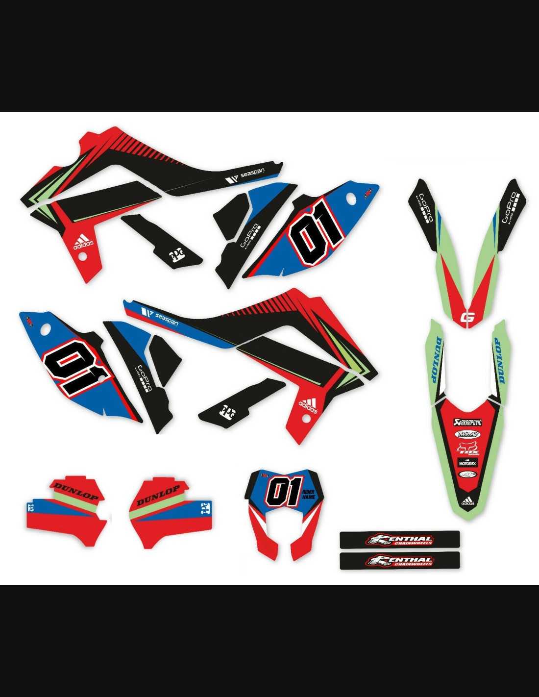 Los adhesivos que producimos están fabricados con materiales crystal de primera calidad que se adaptarán fácil y perfectamente a los plásticos de la motocicleta del cliente. La resistencia del material permite que nuestro gráfico permanezca perfectamente adherido incluso durante las condiciones de uso más difíciles de la motocicleta. La instalación, gracias a los canales de descarga de aire, permite instalar las pegatinas de forma suave y sin burbujas. Utilizamos maquinarias de última generación para la impresión, por lo que podemos imprimir colores brillantes y tonalidades de alta calidad. Incluimos una capa protectora en los adhesivos, para que estén siempre brillantes durante los años y estén protegidas del agua y la suciedad. Es posible personalizar las pegatinas como prefiera. Puede agregar, eliminar o cambiar patrocinadores técnicos, agregar un número de carrera personalizado o su propio nombre. Puede indicar todos los cambios en el campo "Personalización del producto" en el sitio web durante la compra. No nos limitamos solo a los gráficos de nuestro sitio web, puede enviarnos por correo electrónico o WhatsApp una imagen de un diseño que no tenemos, para que podamos hacerle un presupuesto y luego hacerlo. Mediante la compra, se aceptan las condiciones de venta.