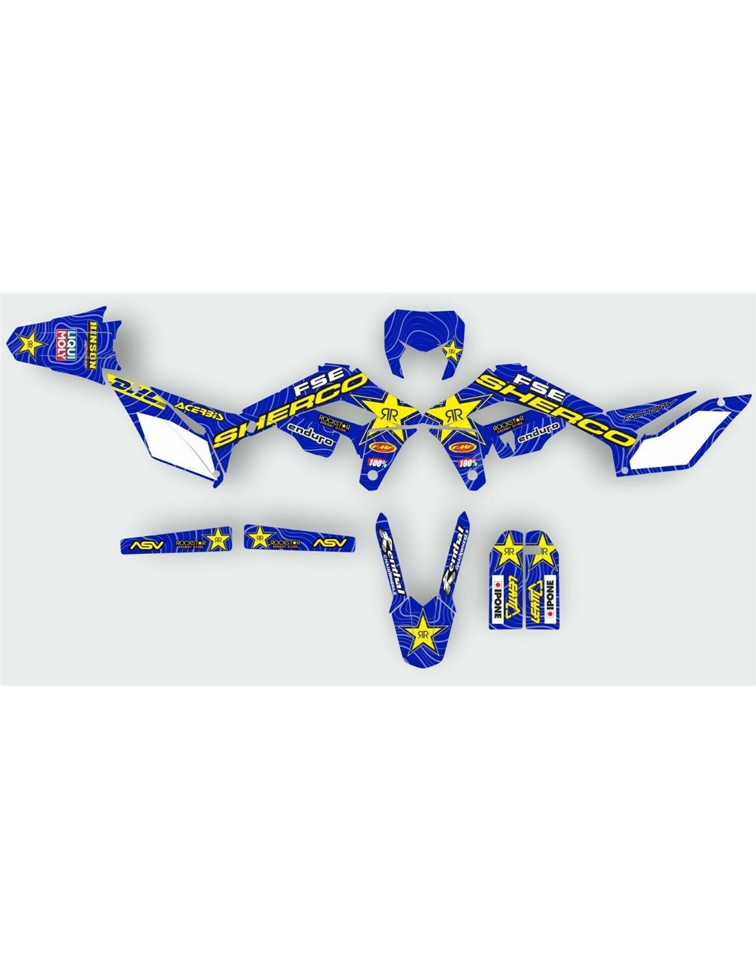 Los adhesivos que producimos están fabricados con materiales crystal de primera calidad que se adaptarán fácil y perfectamente a los plásticos de la motocicleta del cliente. La resistencia del material permite que nuestro gráfico permanezca perfectamente adherido incluso durante las condiciones de uso más difíciles de la motocicleta. La instalación, gracias a los canales de descarga de aire, permite instalar las pegatinas de forma suave y sin burbujas. Utilizamos maquinarias de última generación para la impresión, por lo que podemos imprimir colores brillantes y tonalidades de alta calidad. Incluimos una capa protectora en los adhesivos, para que estén siempre brillantes durante los años y estén protegidas del agua y la suciedad. Es posible personalizar las pegatinas como prefiera. Puede agregar, eliminar o cambiar patrocinadores técnicos, agregar un número de carrera personalizado o su propio nombre. Puede indicar todos los cambios en el campo "Personalización del producto" en el sitio web durante la compra. No nos limitamos solo a los gráficos de nuestro sitio web, puede enviarnos por correo electrónico o WhatsApp una imagen de un diseño que no tenemos, para que podamos hacerle un presupuesto y luego hacerlo. Mediante la compra, se aceptan las condiciones de venta.