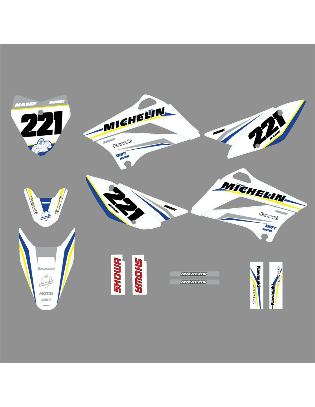 Los adhesivos que producimos están fabricados con materiales crystal de primera calidad que se adaptarán fácil y perfectamente a los plásticos de la motocicleta del cliente. La resistencia del material permite que nuestro gráfico permanezca perfectamente adherido incluso durante las condiciones de uso más difíciles de la motocicleta. La instalación, gracias a los canales de descarga de aire, permite instalar las pegatinas de forma suave y sin burbujas. Utilizamos maquinarias de última generación para la impresión, por lo que podemos imprimir colores brillantes y tonalidades de alta calidad. Incluimos una capa protectora en los adhesivos, para que estén siempre brillantes durante los años y estén protegidas del agua y la suciedad. Es posible personalizar las pegatinas como prefiera. Puede agregar, eliminar o cambiar patrocinadores técnicos, agregar un número de carrera personalizado o su propio nombre. Puede indicar todos los cambios en el campo "Personalización del producto" en el sitio web durante la compra. No nos limitamos solo a los gráficos de nuestro sitio web, puede enviarnos por correo electrónico o WhatsApp una imagen de un diseño que no tenemos, para que podamos hacerle un presupuesto y luego hacerlo. Mediante la compra, se aceptan las condiciones de venta.