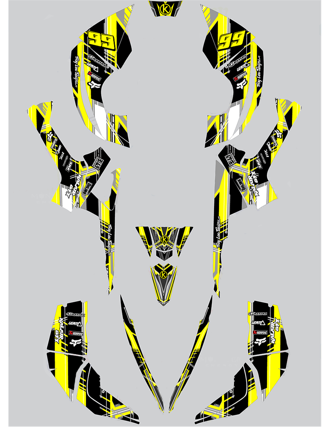 Los adhesivos que producimos están fabricados con materiales crystal de primera calidad que se adaptarán fácil y perfectamente a los plásticos de la motocicleta del cliente. La resistencia del material permite que nuestro gráfico permanezca perfectamente adherido incluso durante las condiciones de uso más difíciles de la motocicleta. La instalación, gracias a los canales de descarga de aire, permite instalar las pegatinas de forma suave y sin burbujas. Utilizamos maquinarias de última generación para la impresión, por lo que podemos imprimir colores brillantes y tonalidades de alta calidad. Incluimos una capa protectora en los adhesivos, para que estén siempre brillantes durante los años y estén protegidas del agua y la suciedad. Es posible personalizar las pegatinas como prefiera. Puede agregar, eliminar o cambiar patrocinadores técnicos, agregar un número de carrera personalizado o su propio nombre. Puede indicar todos los cambios en el campo "Personalización del producto" en el sitio web durante la compra. No nos limitamos solo a los gráficos de nuestro sitio web, puede enviarnos por correo electrónico o WhatsApp una imagen de un diseño que no tenemos, para que podamos hacerle un presupuesto y luego hacerlo. Mediante la compra, se aceptan las condiciones de venta.