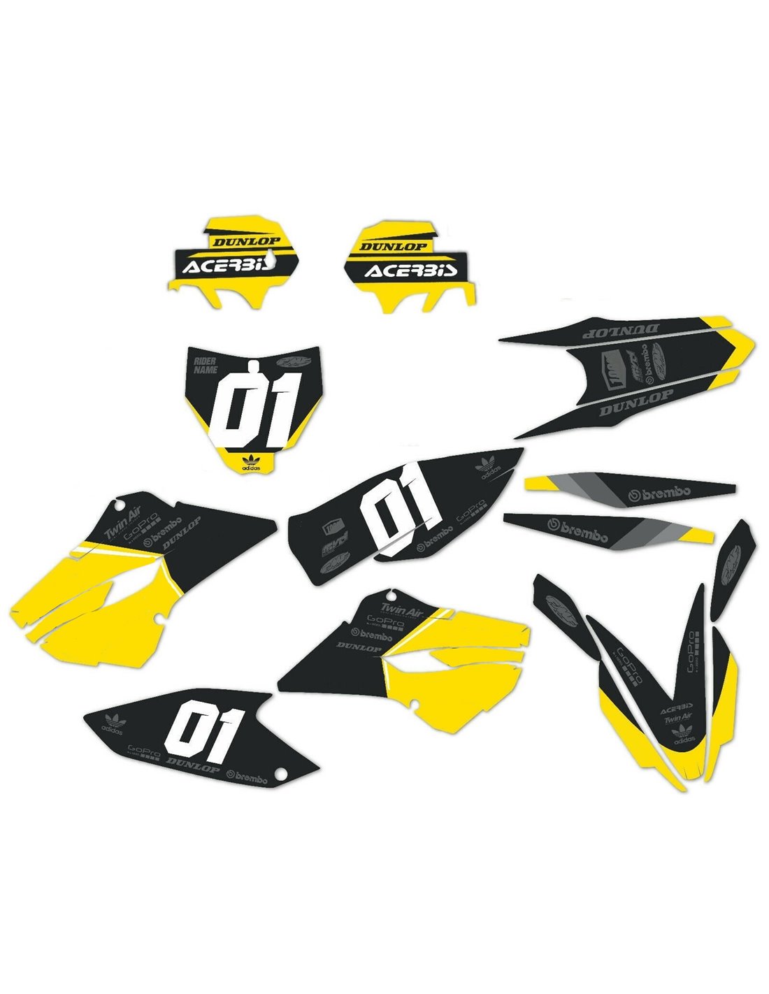 Les autocollants que nous produisons sont fabriqués à partir de matériaux crystal de première qualité qui s'adapteront facilement et parfaitement sur les plastiques de la moto du client. La résistance du matériau permet à notre graphisme de rester parfaitement collé même dans les conditions d'utilisation les plus difficiles de la moto. L'installation, grâce aux canaux d'évacuation d'air, vous permet d'installer les autocollants en douceur et sans bulles. Nous utilisons des machines de dernière génération pour l'impression, nous pouvons donc imprimer des couleurs vives et des nuances de haute qualité. Nous incluons une couche protectrice sur les autocollants, afin qu'ils soient toujours brillants au fil des ans et soient protégés contre l'eau et la saleté. Il est possible de personnaliser les autocollants selon vos préférences. Vous pouvez ajouter, supprimer ou modifier des sponsors techniciens, ajouter un numéro de course personnalisé ou votre propre nom. Vous pouvez indiquer toutes les modifications dans le champ «Personnalisation» sur le site Web lors de l'achat. Nous ne nous limitons pas seulement aux graphiques sur notre site Web, vous pouvez nous envoyer par e-mail ou WhatsApp une photo d'un design que nous n'avons pas, afin que nous puissions vous faire un devis et ensuite le faire. Par l'achat, vous acceptez les conditions de vente.