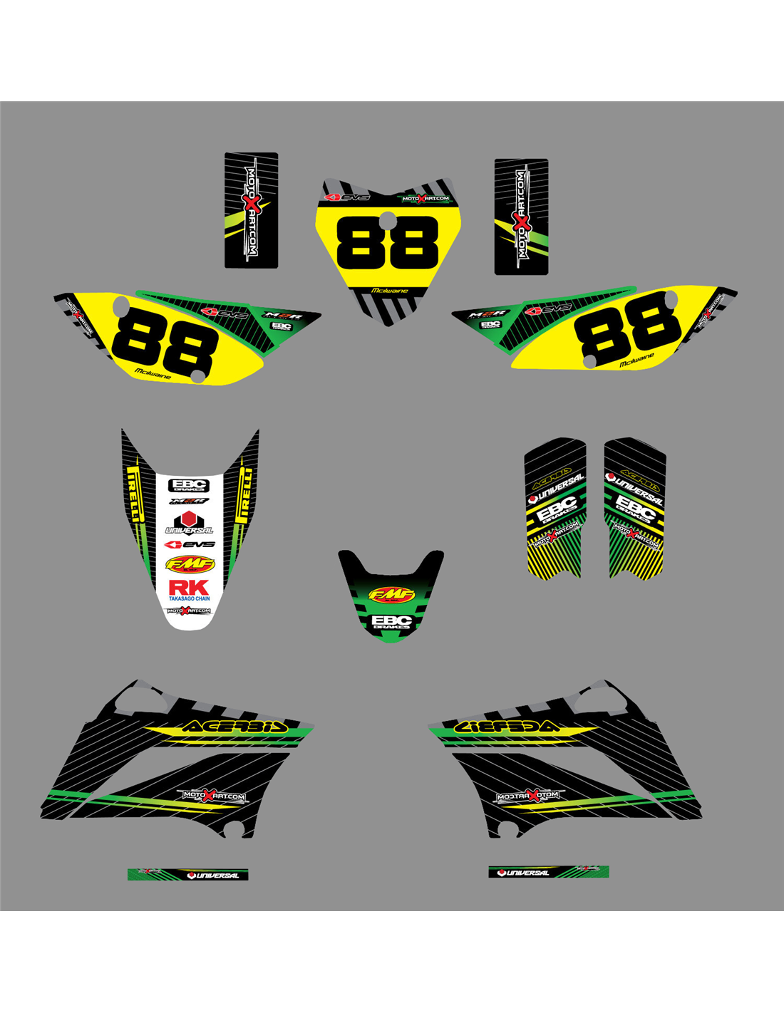 Les autocollants que nous produisons sont fabriqués à partir de matériaux crystal de première qualité qui s'adapteront facilement et parfaitement sur les plastiques de la moto du client. La résistance du matériau permet à notre graphisme de rester parfaitement collé même dans les conditions d'utilisation les plus difficiles de la moto. L'installation, grâce aux canaux d'évacuation d'air, vous permet d'installer les autocollants en douceur et sans bulles. Nous utilisons des machines de dernière génération pour l'impression, nous pouvons donc imprimer des couleurs vives et des nuances de haute qualité. Nous incluons une couche protectrice sur les autocollants, afin qu'ils soient toujours brillants au fil des ans et soient protégés contre l'eau et la saleté. Il est possible de personnaliser les autocollants selon vos préférences. Vous pouvez ajouter, supprimer ou modifier des sponsors techniciens, ajouter un numéro de course personnalisé ou votre propre nom. Vous pouvez indiquer toutes les modifications dans le champ «Personnalisation» sur le site Web lors de l'achat. Nous ne nous limitons pas seulement aux graphiques sur notre site Web, vous pouvez nous envoyer par e-mail ou WhatsApp une photo d'un design que nous n'avons pas, afin que nous puissions vous faire un devis et ensuite le faire. Par l'achat, vous acceptez les conditions de vente.