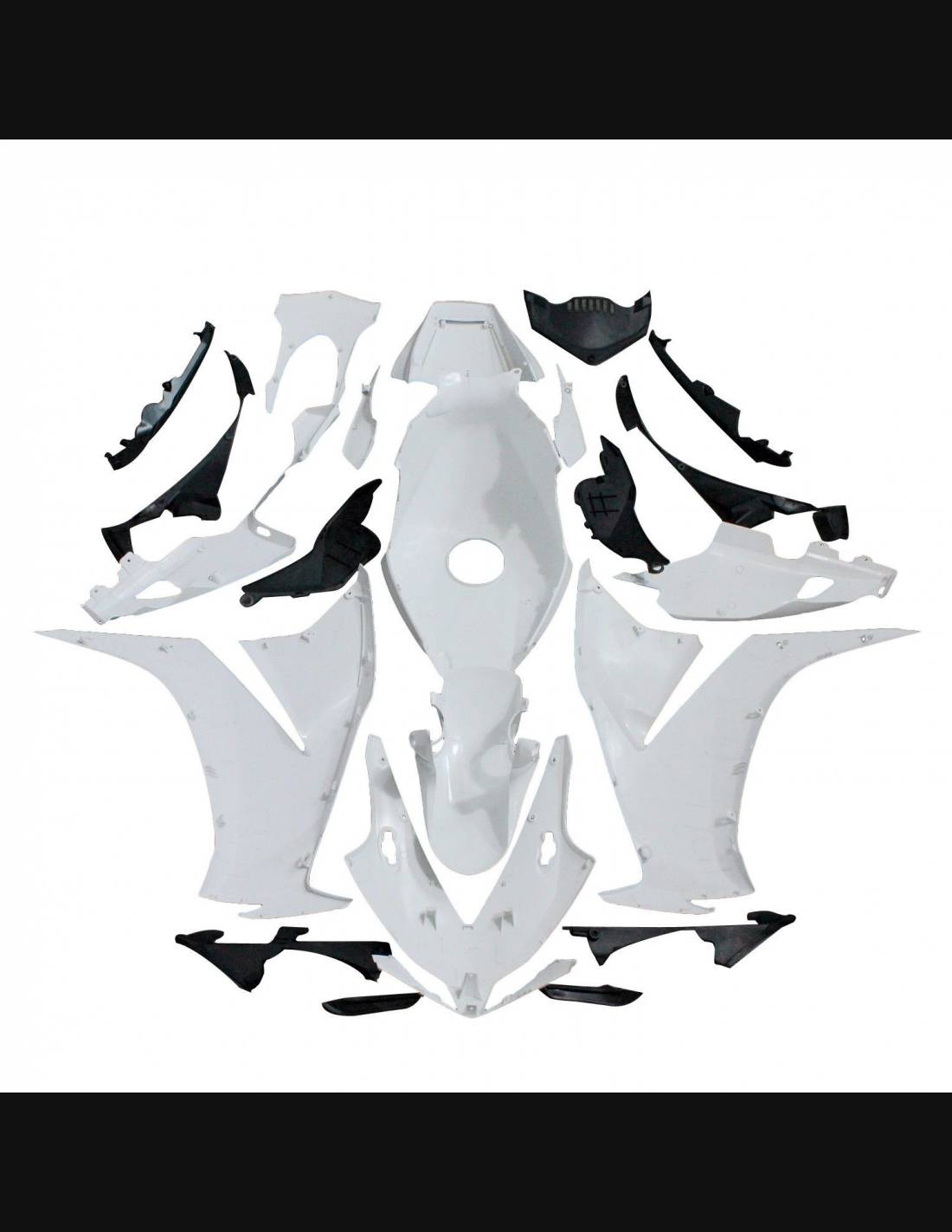Le kit carénage comprend : tête de fourche, flanc gauche et droit, bas de carénage gauche et droit, coque arrière, garde boue avant, Cache réservoir et tous les parties noir pour compléter les carénages.