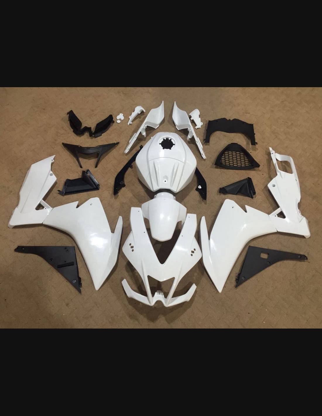 Le kit carénage comprend : tête de fourche, flanc gauche et droit, bas de carénage gauche et droit, coque arrière, garde boue avant, Cache réservoir et tous les parties noir pour compléter les carénages.