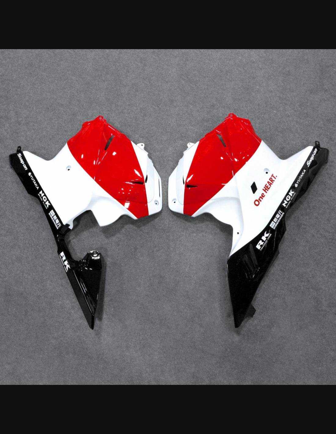 Les carénages sont fait en ABS (plastique) et sont compatible avec les carénages d’origine de la moto. Sont fournis déjà avec tous les trous et les supports internement, pour garantir un montage facile et sans modification, sur la moto de client. Aussi les carénages sont compatible avec les vis et tous les autre accessoires d’origine de la moto. Dans le prix est inclus aussi la protection chaleur pour le bas de carénage.