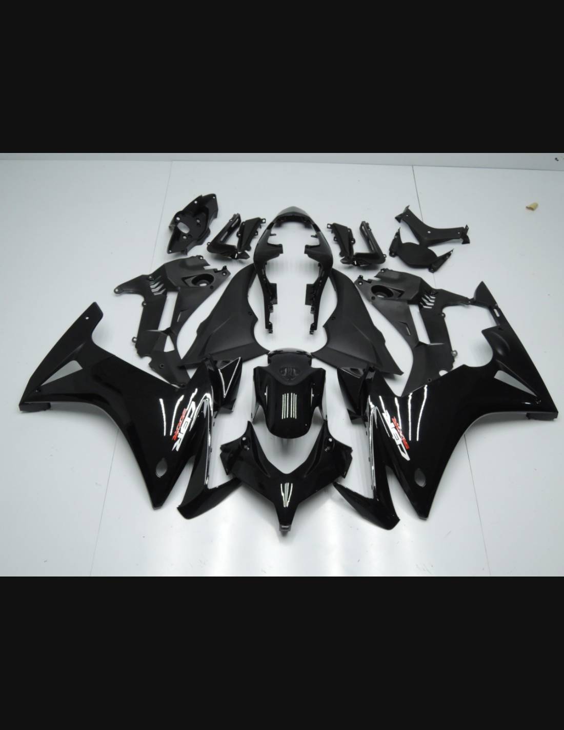 Le kit carénage comprend: tête de fourche, flanc gauche et droit, bas de carénage gauche et droit, coque arrière, garde boue avant et tous les parties noir pour compléter les carénages.