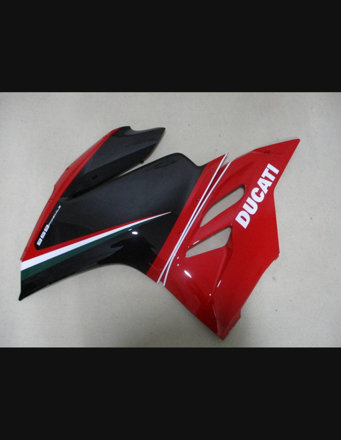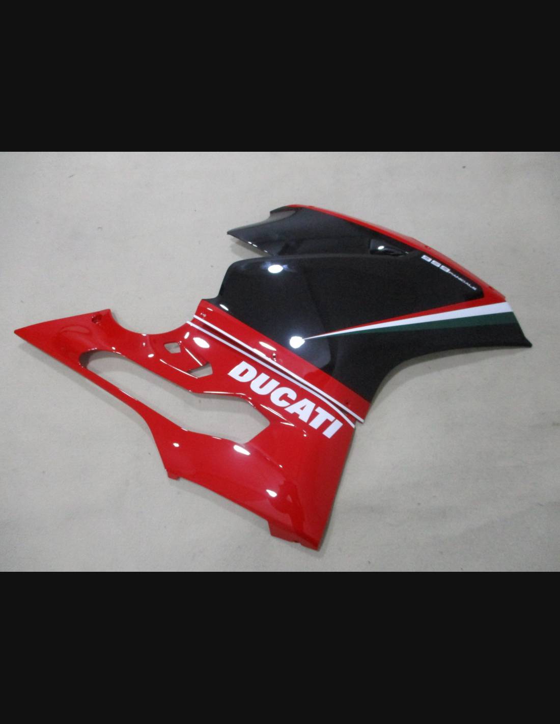 élite : nous utilisons les couleurs originales de la moto (Rouge Ducati) ; les adhésifs viennent imprimé avec les nuances différentes grâce à notre ploter de coupe et de presse aux 8 couleurs et aux encres ECO-SOL MAX2 avec une qualité et une résistance aux rayons solaires jusqu`à les 7 ans garantis par la maison APA Italie que nous fournit les matériels de presse et de coupe. Ces matériels sont mis sous 3 couches de transparent de manière telle qu’ils restent luisants pour bien 7 ans. En outre, le carénage entier est peint à l`intérieur.