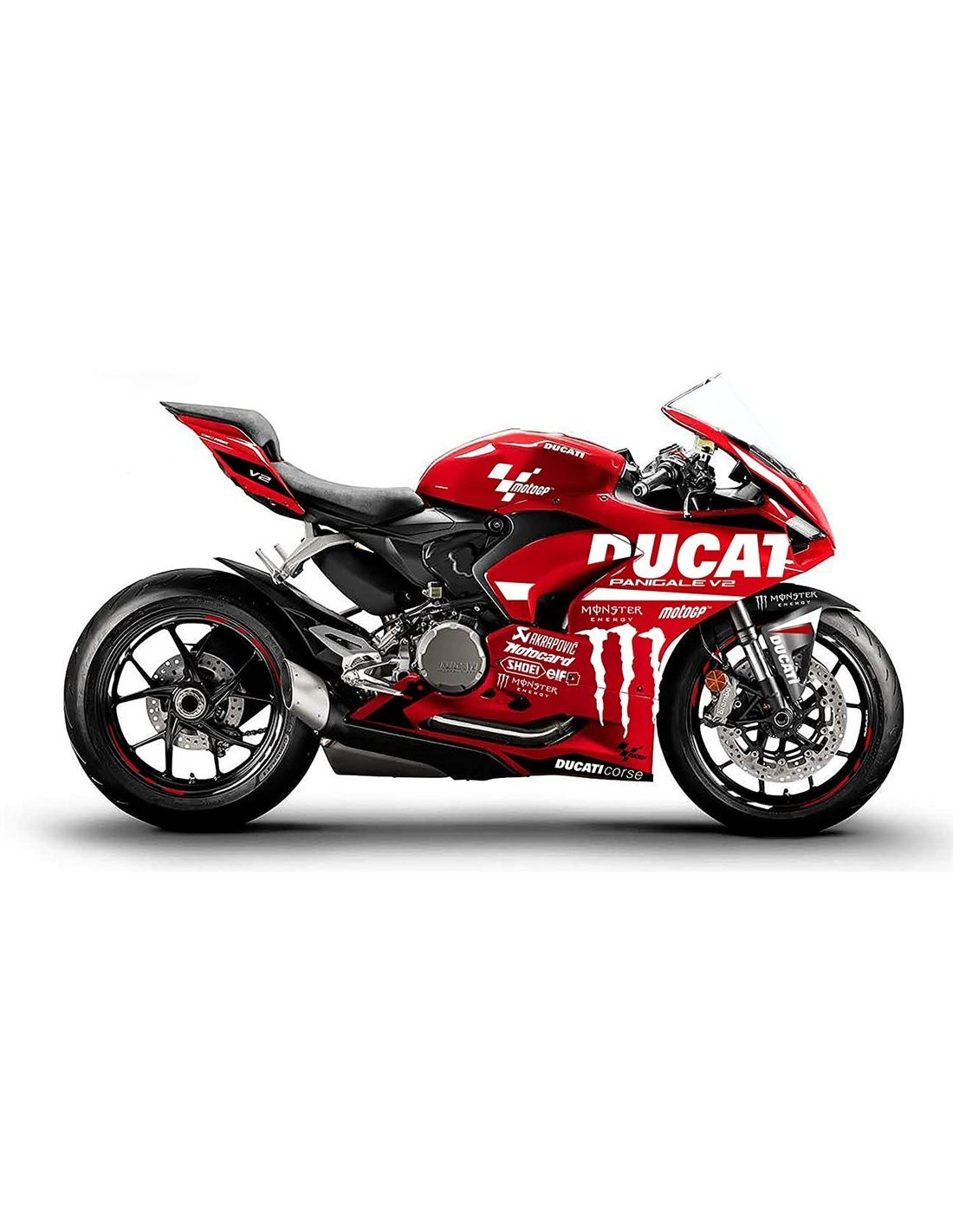 élite : nous utilisons les couleurs originales de la moto (Rouge Ducati) ; les adhésifs viennent imprimé avec les nuances différentes grâce à notre ploter de coupe et de presse aux 8 couleurs et aux encres ECO-SOL MAX2 avec une qualité et une résistance aux rayons solaires jusqu`à les 7 ans garantis par la maison APA Italie que nous fournit les matériels de presse et de coupe. Ces matériels sont mis sous 3 couches de transparent de manière telle qu’ils restent luisants pour bien 7 ans. En outre, le carénage entier est peint à l`intérieur.