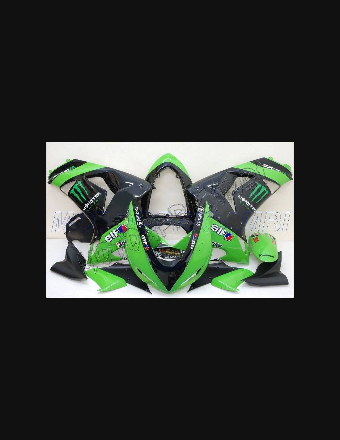 élite : nous utilisons les couleurs originales de la moto (Vert Kawasaki) ; les adhésifs viennent imprimé avec les nuances différentes grâce à notre ploter de coupe et de presse aux 8 couleurs et aux encres ECO-SOL MAX2 avec une qualité et une résistance aux rayons solaires jusqu'à les 7 ans garantis par la maison APA Italie que nous fournit les matériels de presse et de coupe. Ces matériels sont mis sous 3 couches de transparent de manière telle qu’ils restent luisants pour bien 7 ans. En outre, le carénage entier est peint à l'intérieur.
