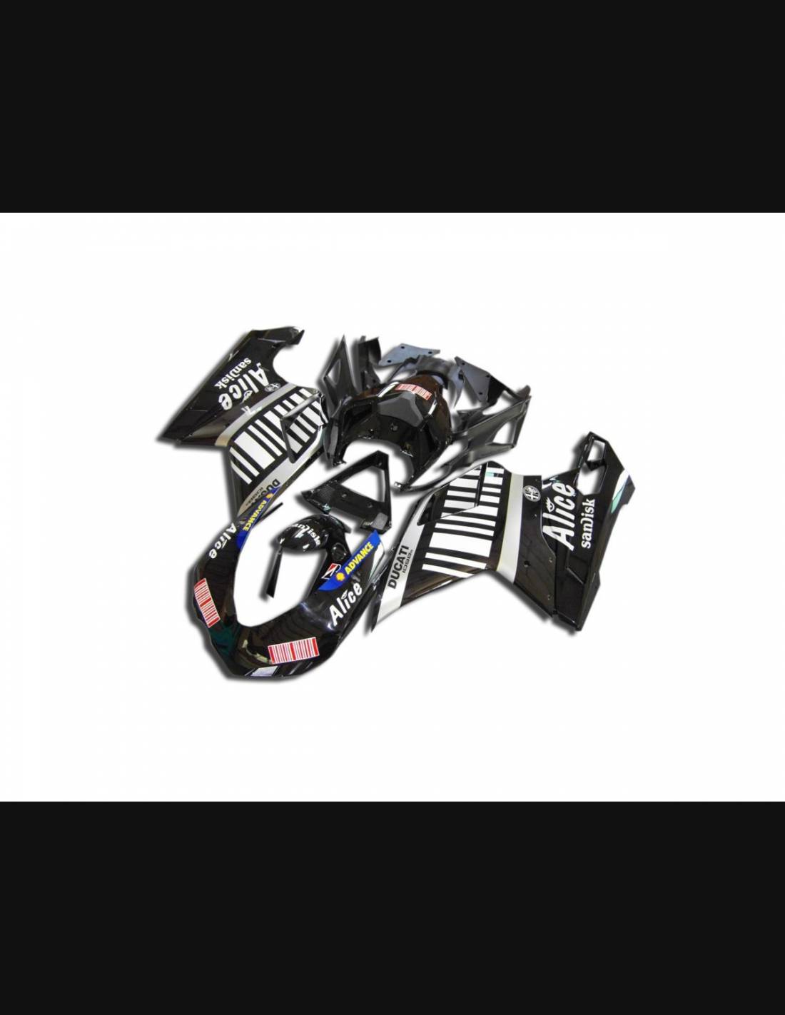 élite : nous utilisons les couleurs originales de la moto (Rouge Ducati) ; les adhésifs viennent imprimé avec les nuances différentes grâce à notre ploter de coupe et de presse aux 8 couleurs et aux encres ECO-SOL MAX2 avec une qualité et une résistance aux rayons solaires jusqu`à les 7 ans garantis par la maison APA Italie que nous fournit les matériels de presse et de coupe. Ces matériels sont mis sous 3 couches de transparent de manière telle qu’ils restent luisants pour bien 7 ans. En outre, le carénage entier est peint à l`intérieur.