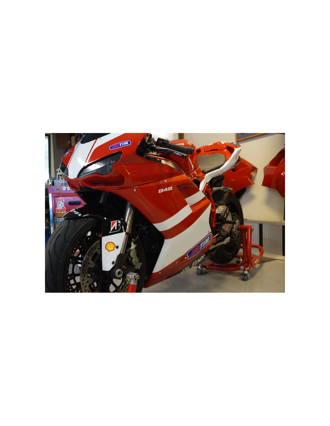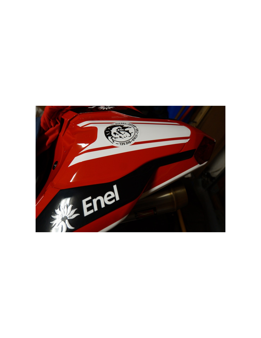 élite : nous utilisons les couleurs originales de la moto (Rouge Ducati) ; les adhésifs viennent imprimé avec les nuances différentes grâce à notre ploter de coupe et de presse aux 8 couleurs et aux encres ECO-SOL MAX2 avec une qualité et une résistance aux rayons solaires jusqu`à les 7 ans garantis par la maison APA Italie que nous fournit les matériels de presse et de coupe. Ces matériels sont mis sous 3 couches de transparent de manière telle qu’ils restent luisants pour bien 7 ans. En outre, le carénage entier est peint à l`intérieur.